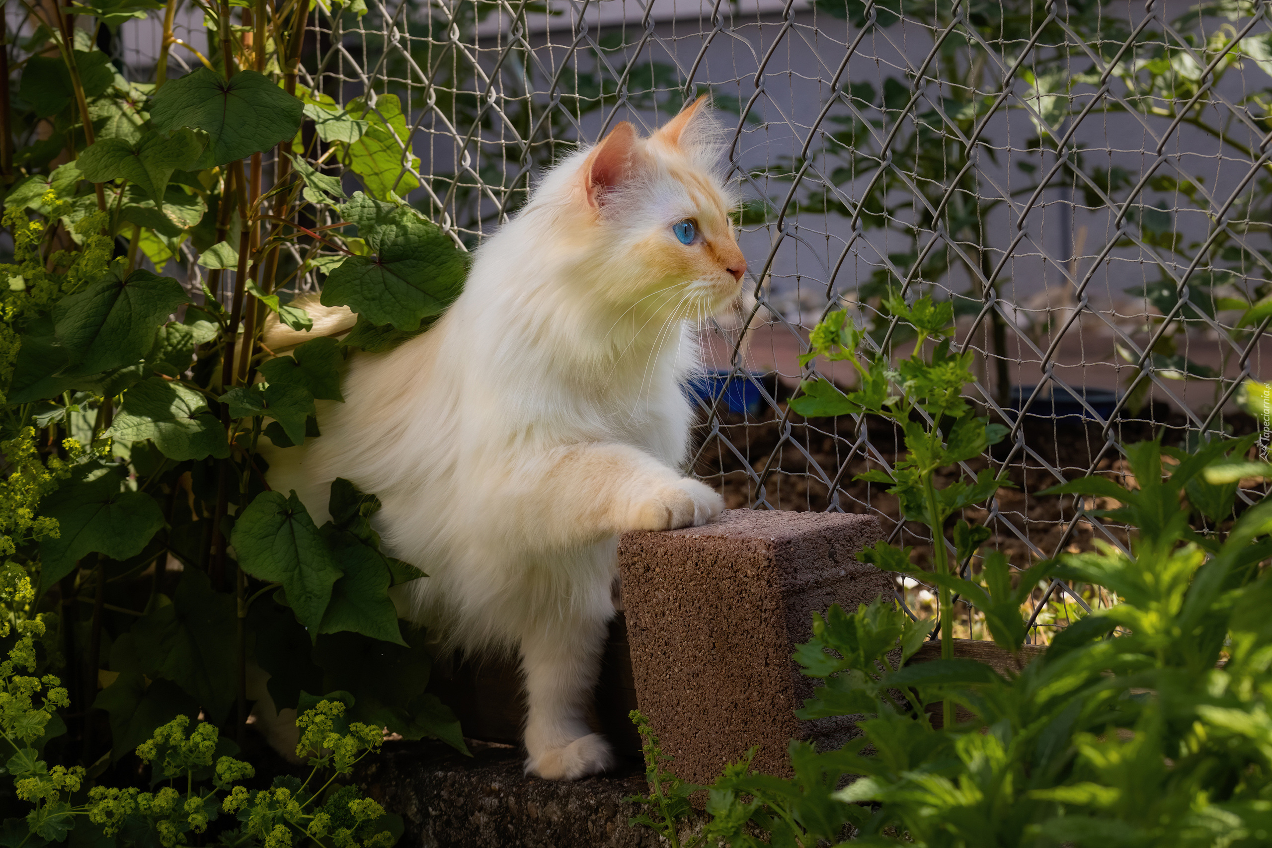 Edytor tapety: Jasnorudy kot z łapką na pustaku w ogrodzie