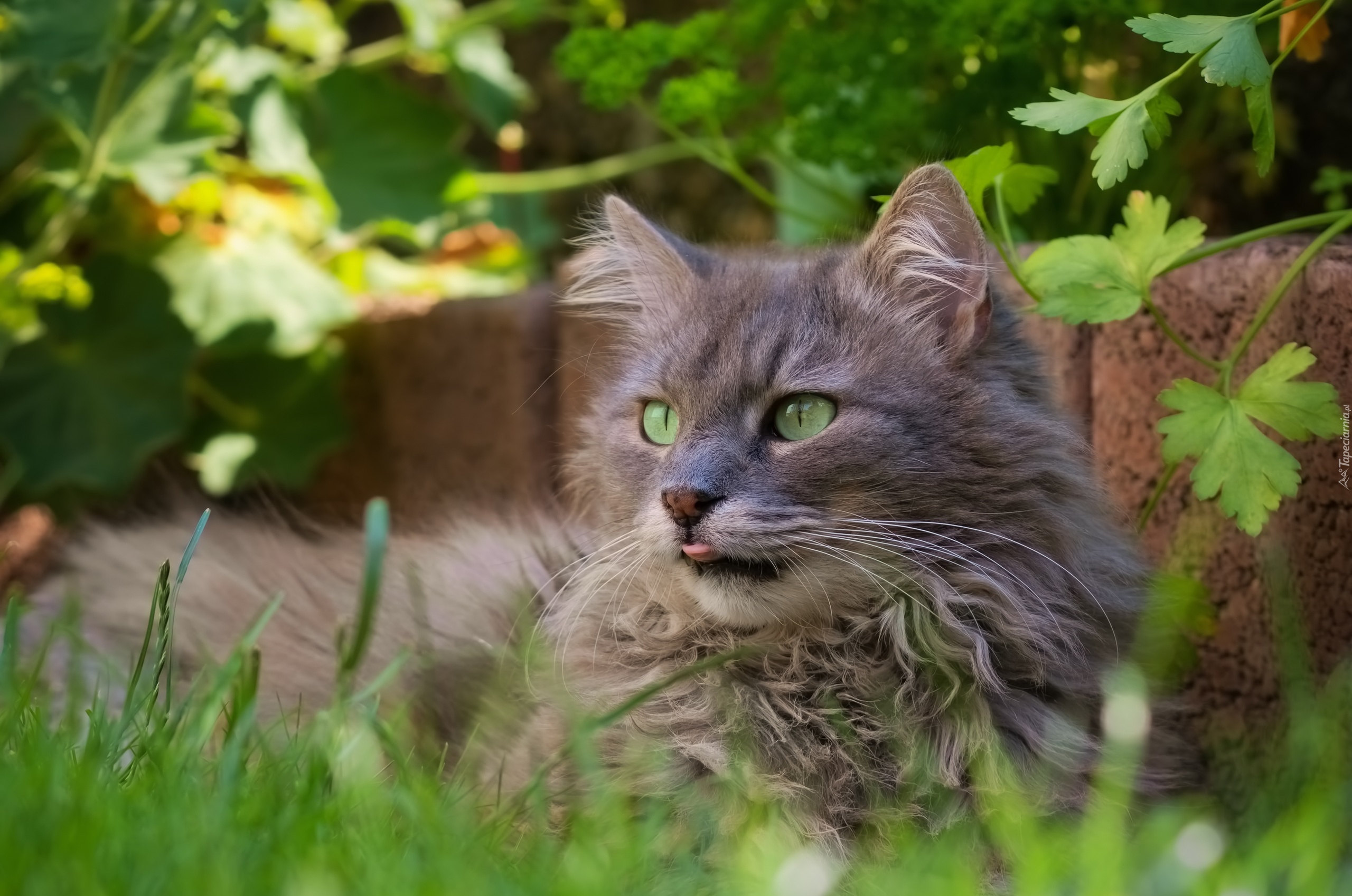 Edytor tapety: Szary długowłosy kot pod murkiem w trawie
