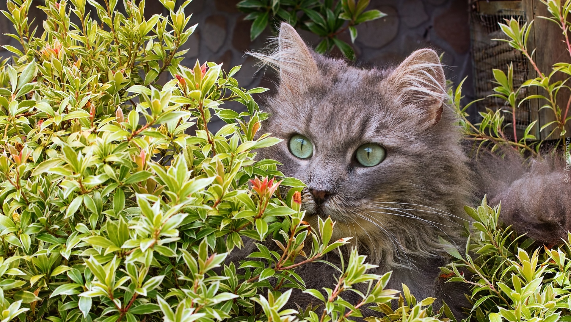 Edytor tapety: Szary zielonooki kot przy zielonym krzewie