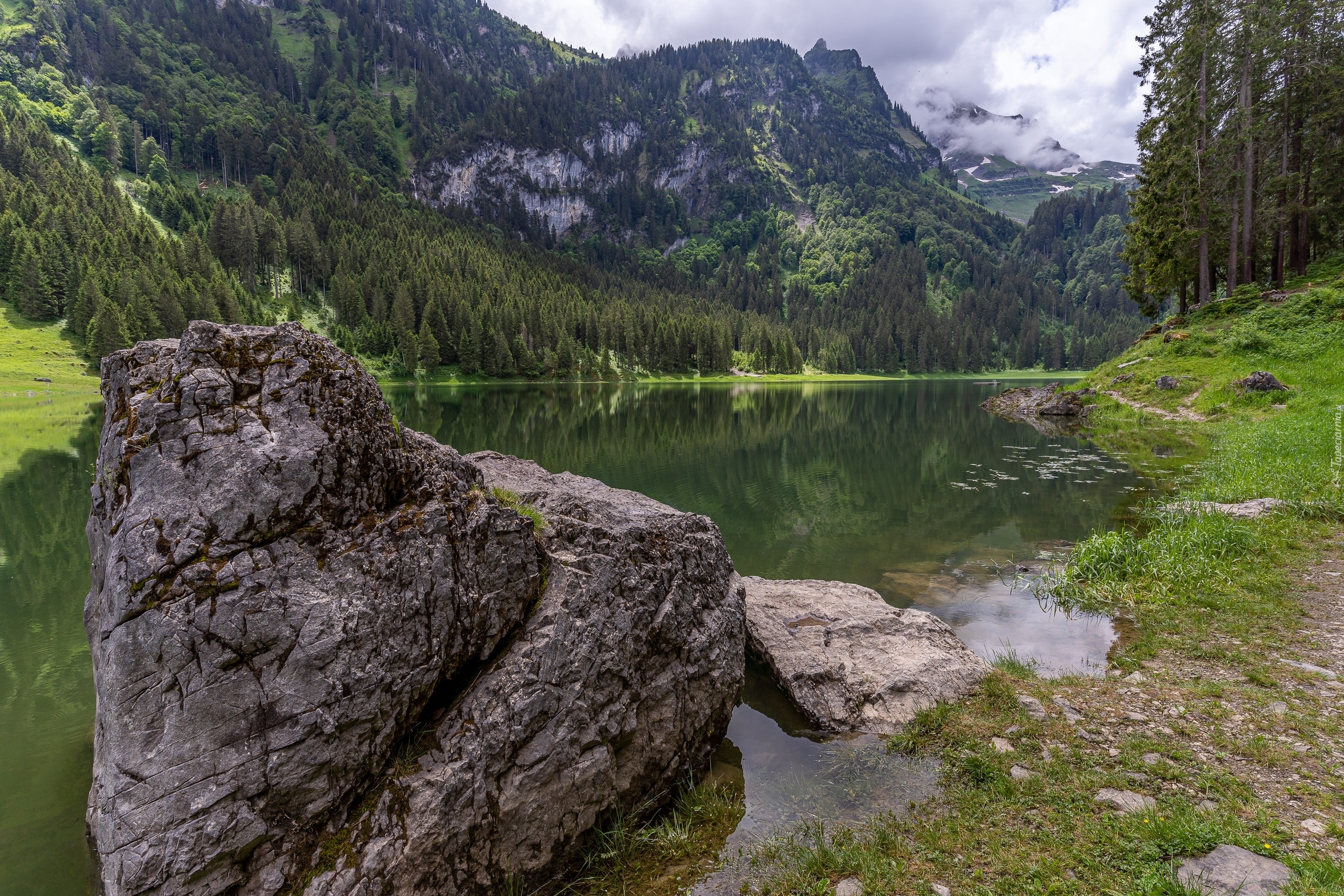 Edytor tapety: Głaz na brzegu jeziora Voralpsee