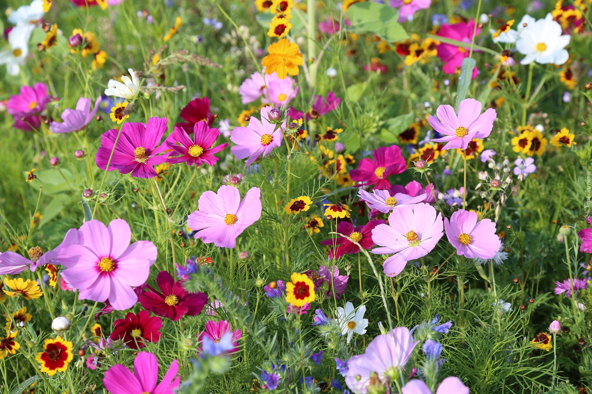 Edytor tapety: Różowa i bordowa kosmea na łące