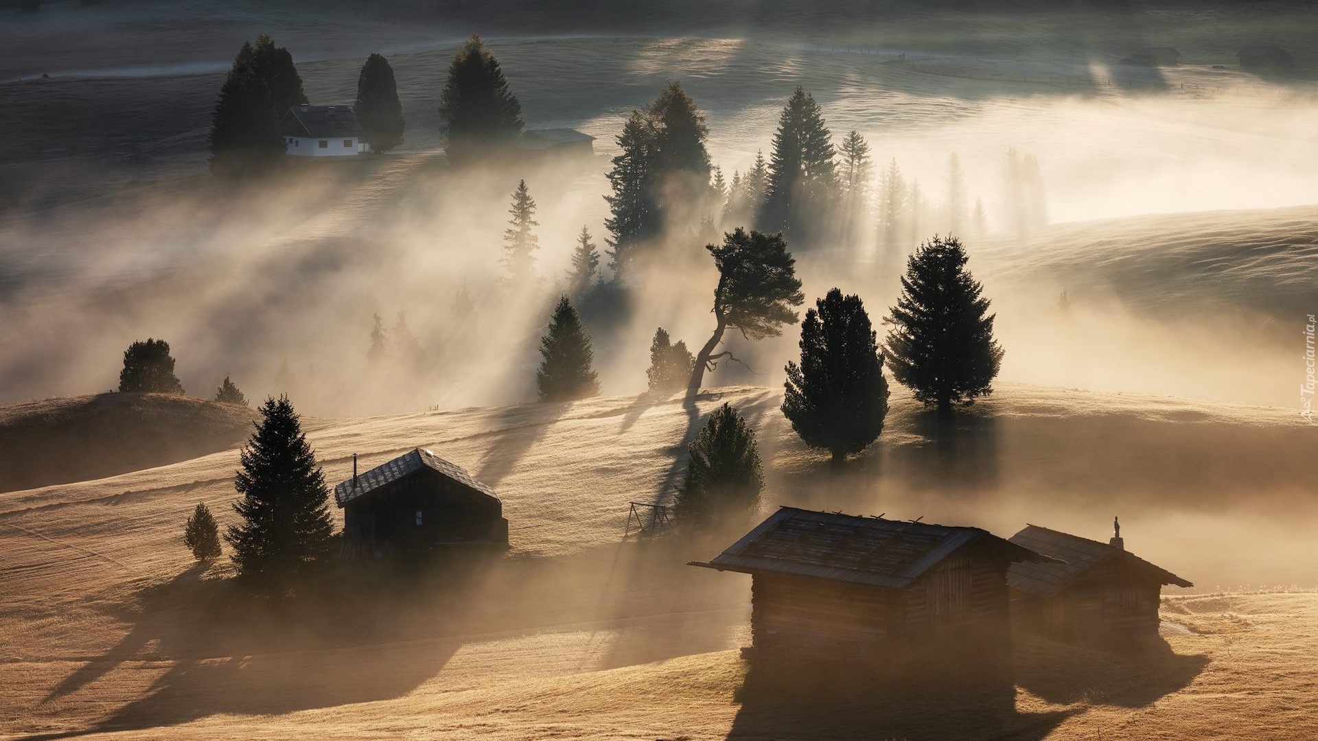 Edytor tapety: Drewniane domki i drzewa spowite mgłą