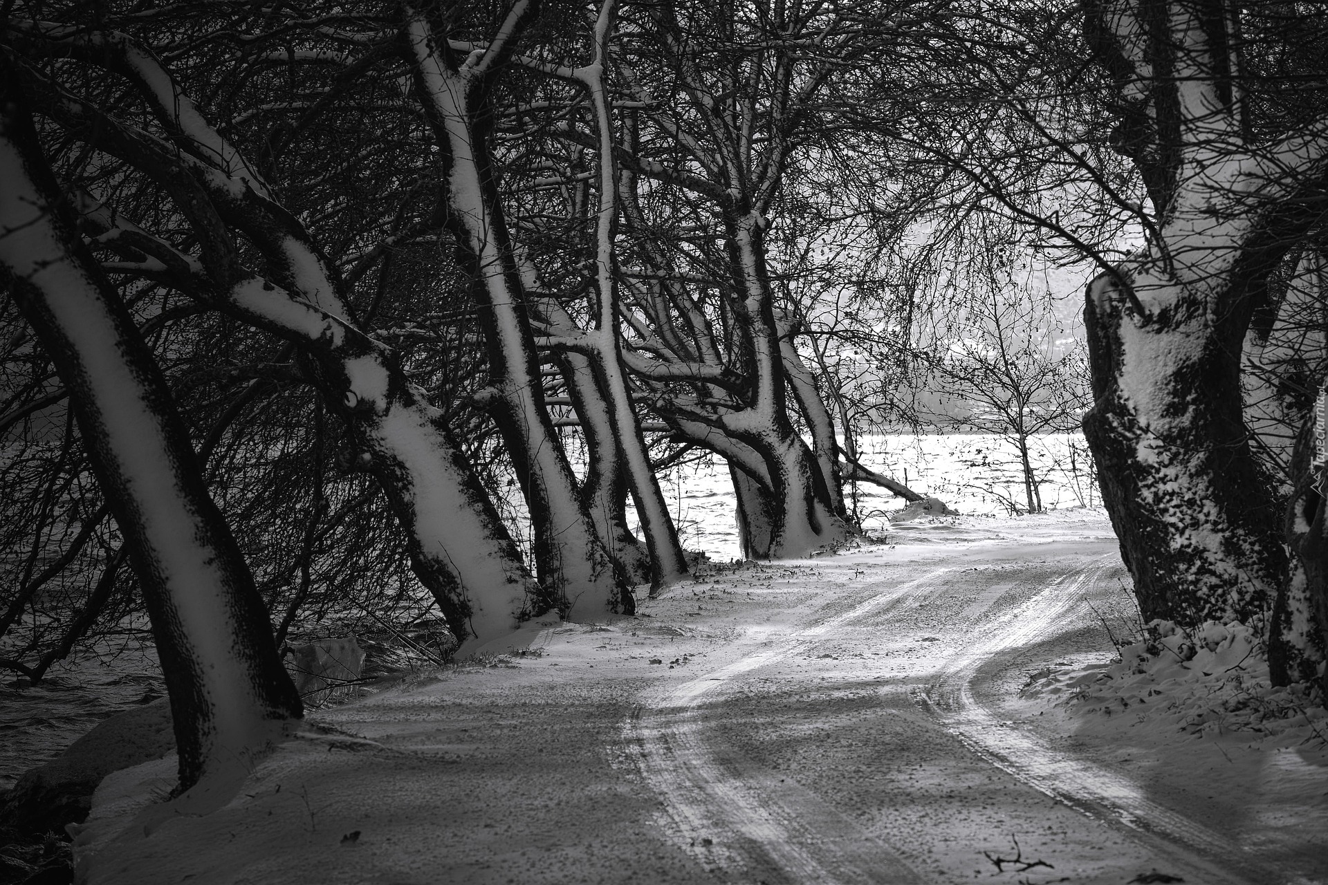 Edytor tapety: Ośnieżona droga pod drzewami