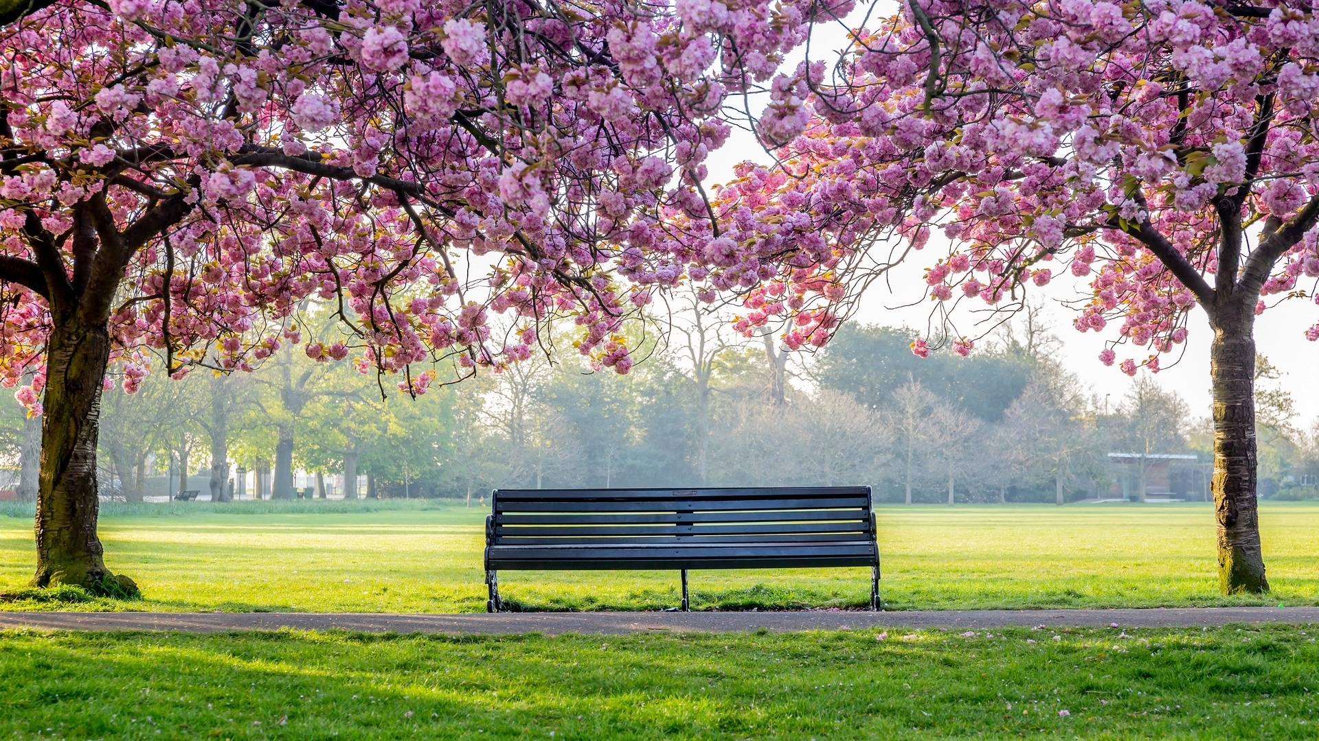 Edytor tapety: Ławka pod okwieconymi drzewami
