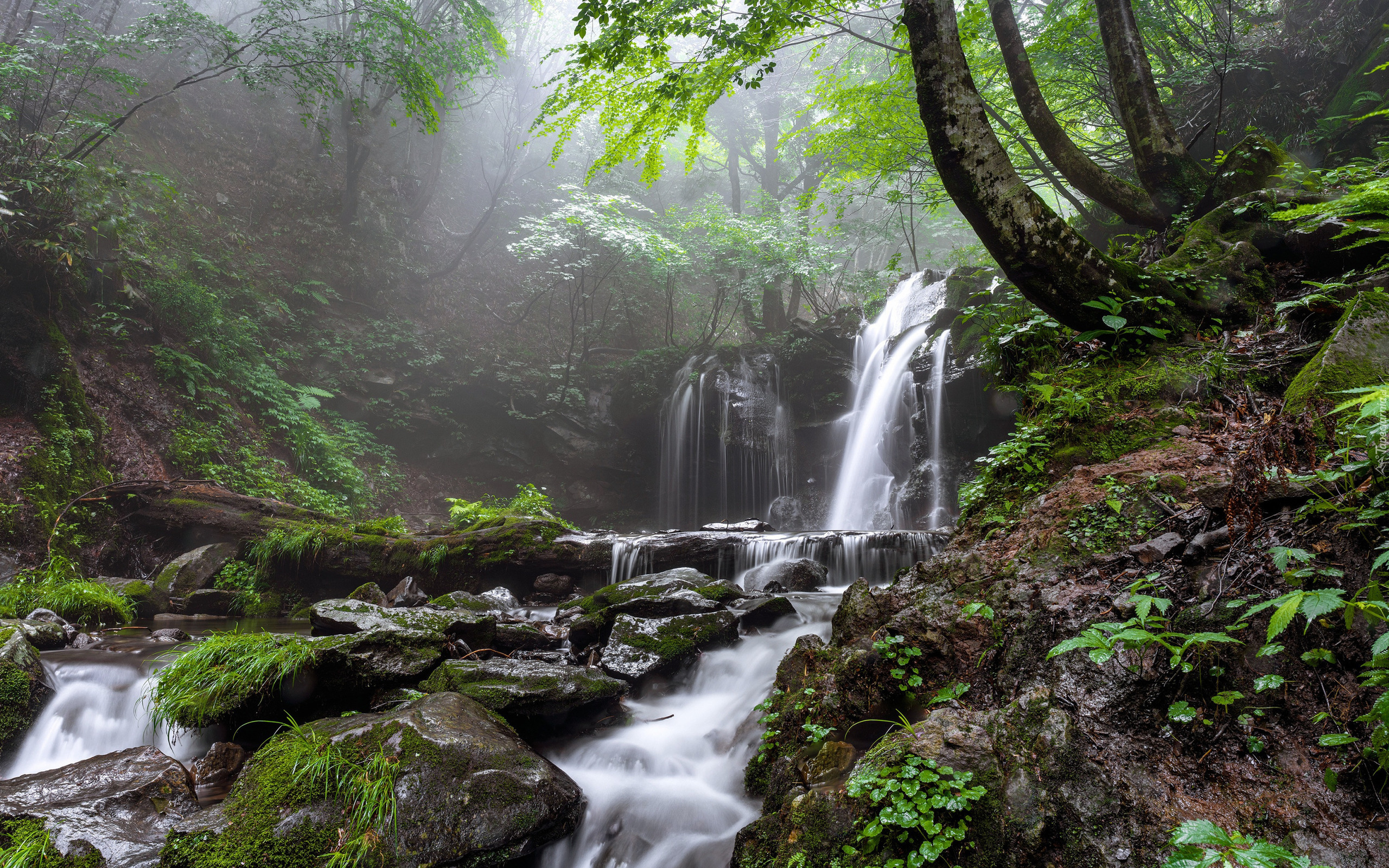Edytor tapety: Wodospad wpadający do kamienistej rzeki w zamglonym lesie