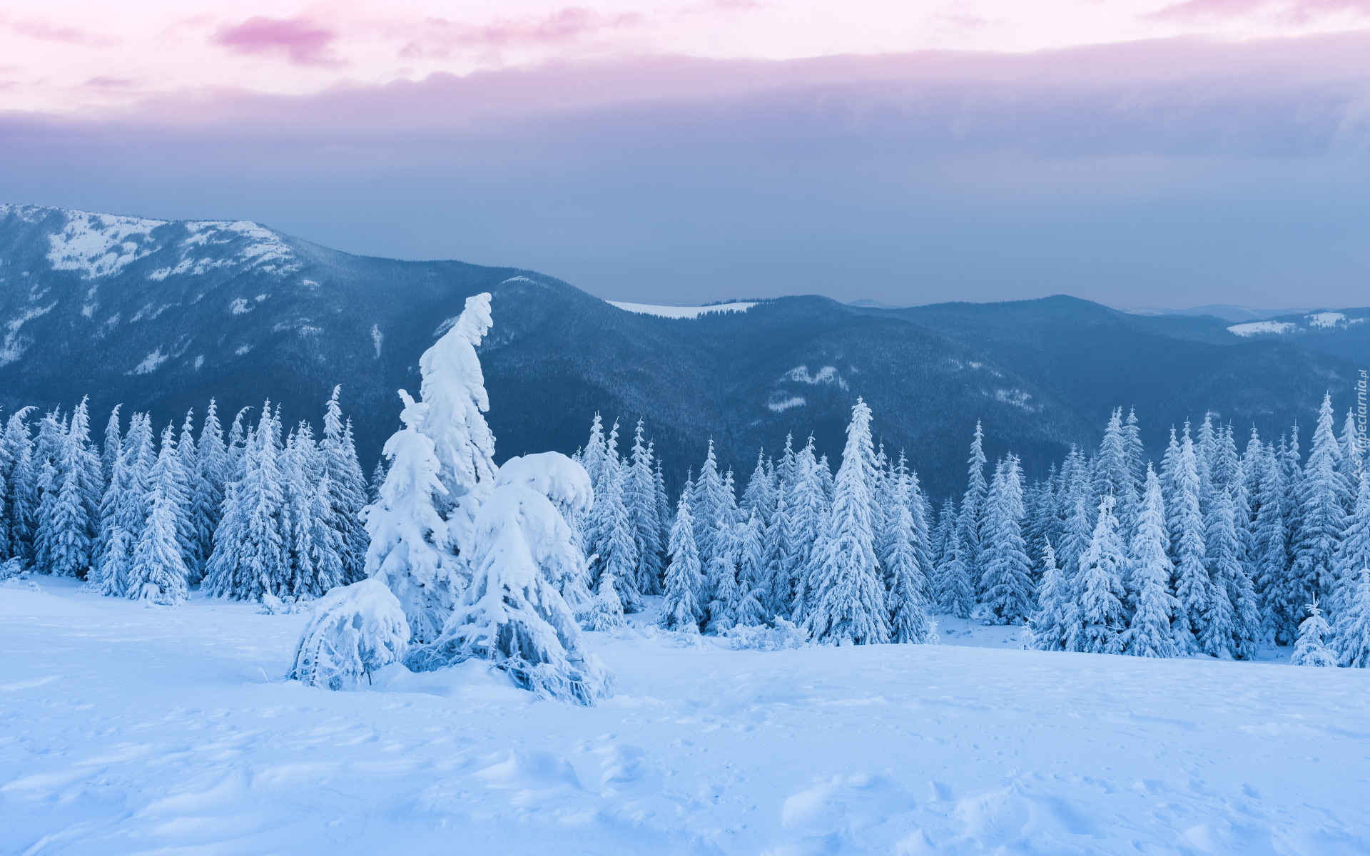 Edytor tapety: Ośnieżone drzewa i góry w tle