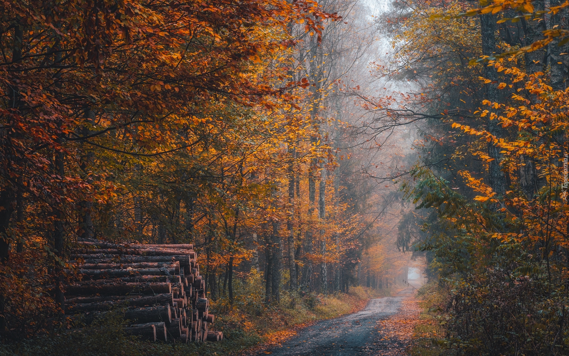 Edytor tapety: Ścięte kłody pod jesiennymi drzewami przy leśnej ścieżce
