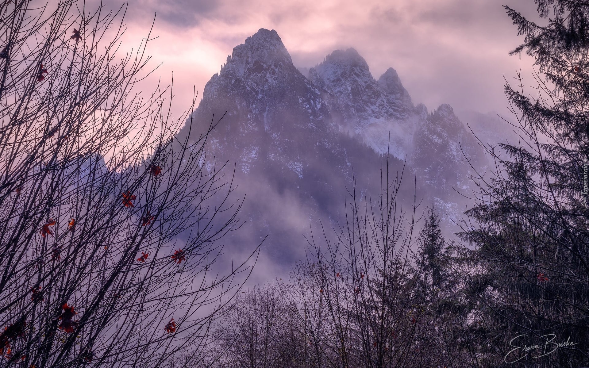 Edytor tapety: Bezlistne drzewa na tle zamglonych gór