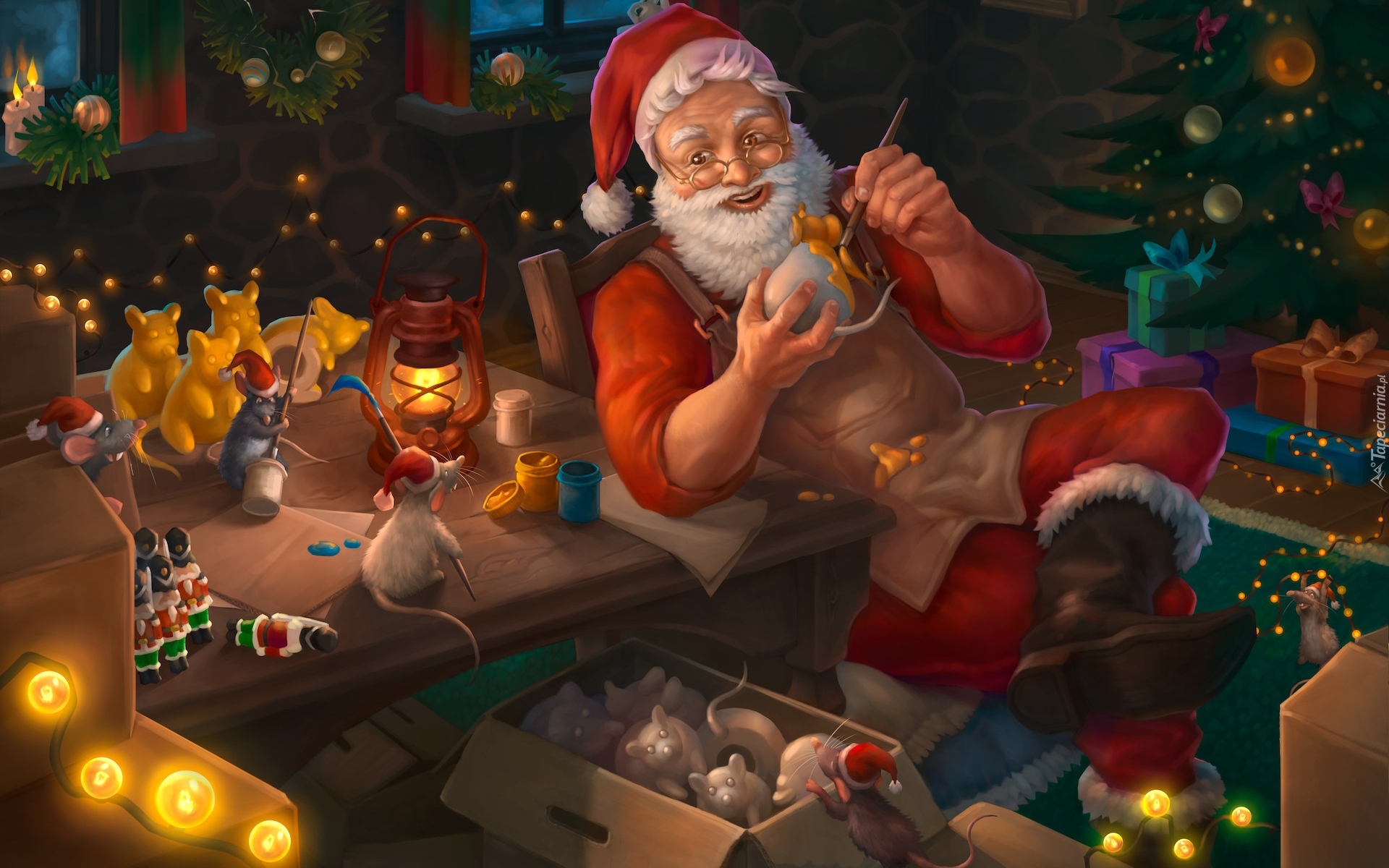 Edytor tapety: Mikołaj ozdabiający bombki w grafice