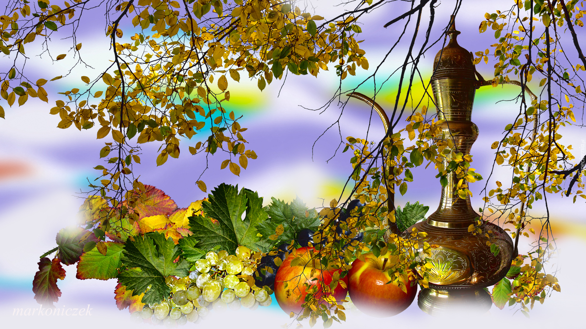 Edytor tapety: Dzbanek obok jabłek i winogron w jesiennej kompozycji