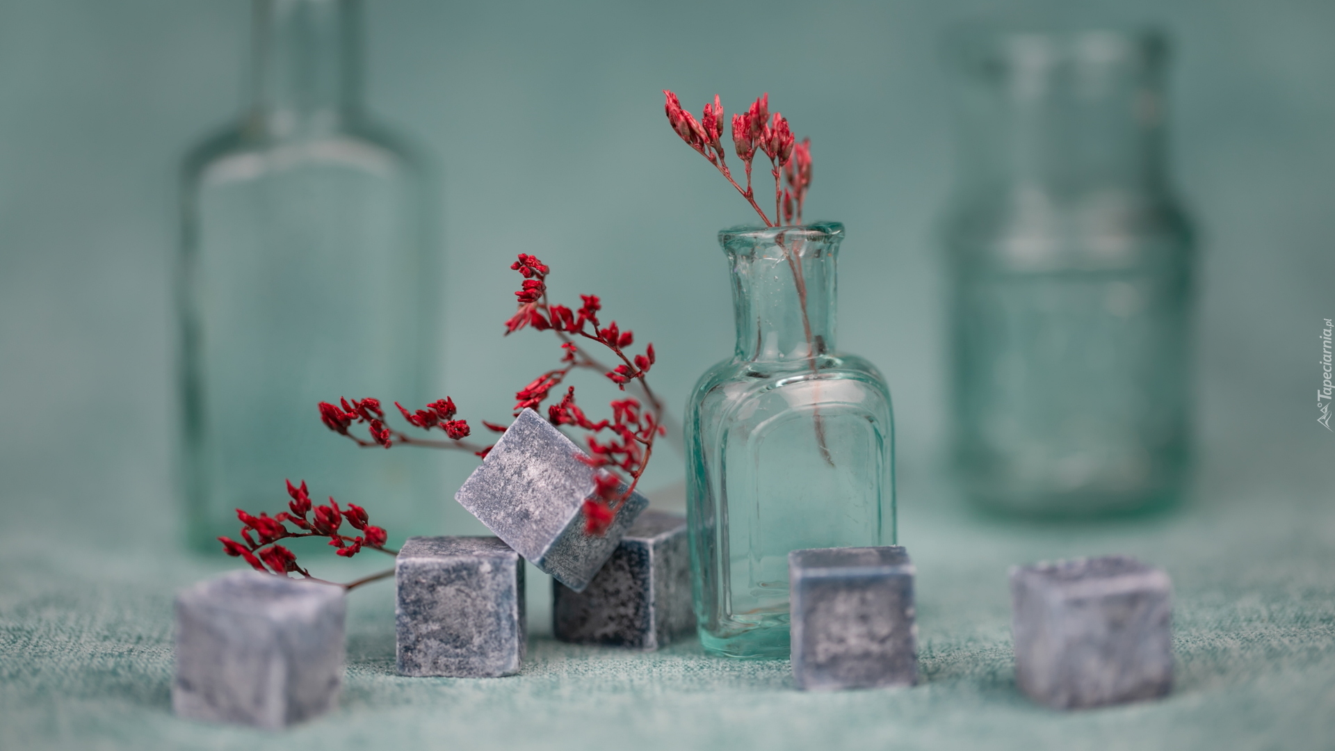 Edytor tapety: Czerwone roślinki na kostkach i w szklanej butelce