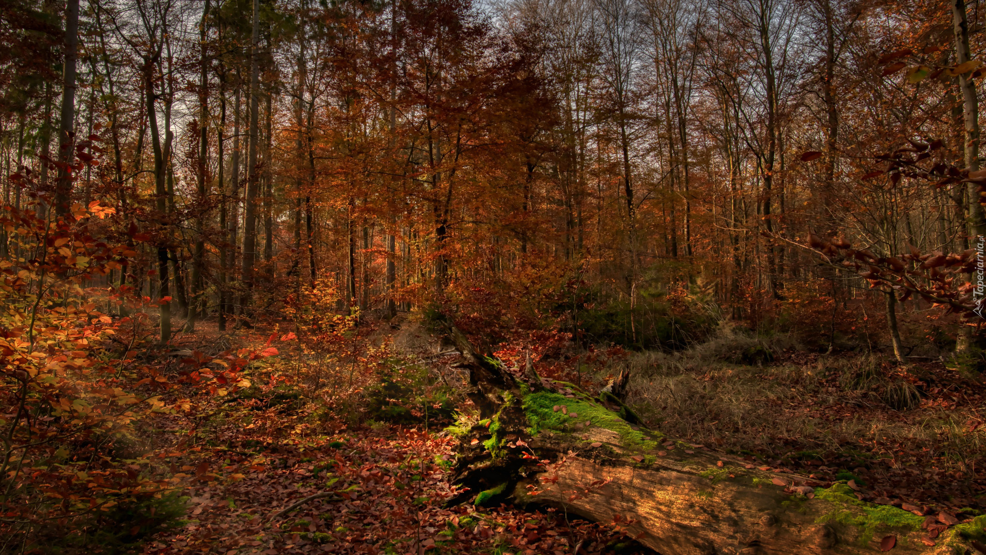 Edytor tapety: Powalony omszały konar w jesiennym lesie