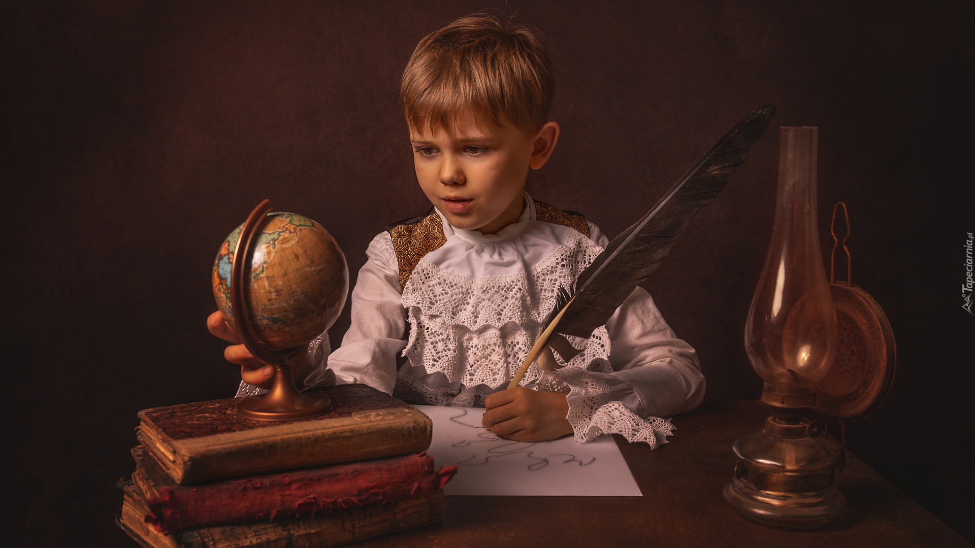 Edytor tapety: Chłopiec przy stole z książkami i globusem