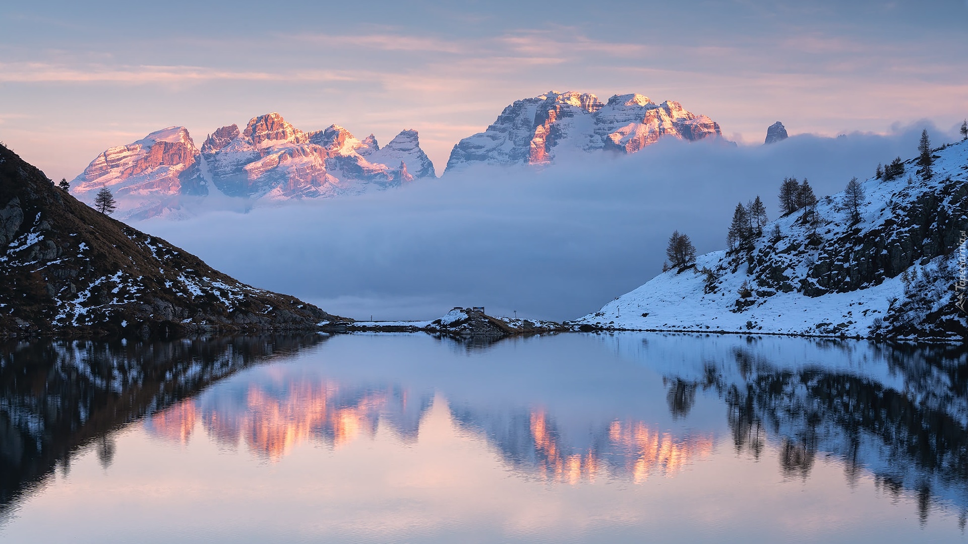 Edytor tapety: Rozświetlone szczyty zamglonych gór nad jeziorem
