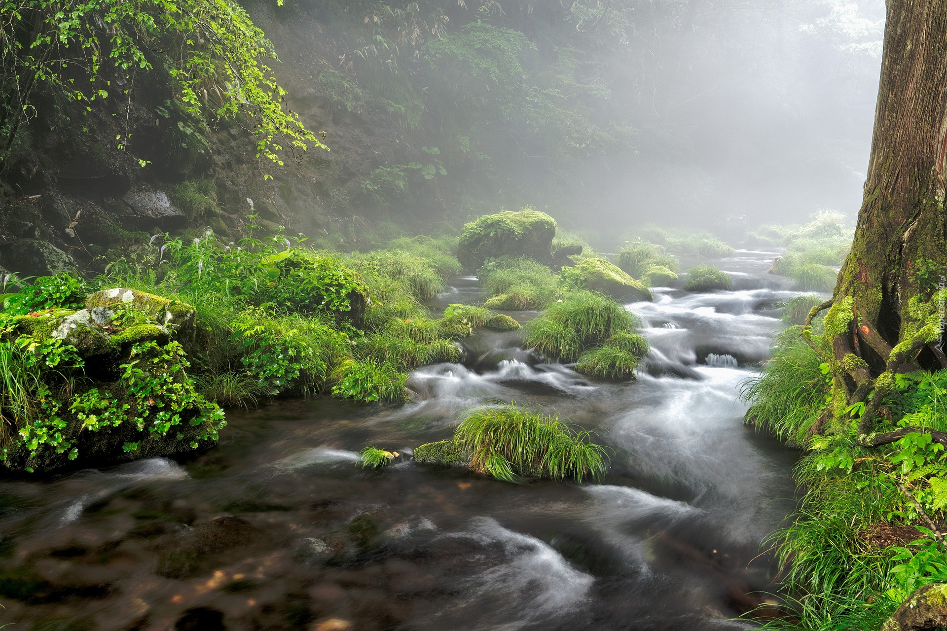 Edytor tapety: Omszałe kamienie i drzewa na brzegach rwącej rzeki