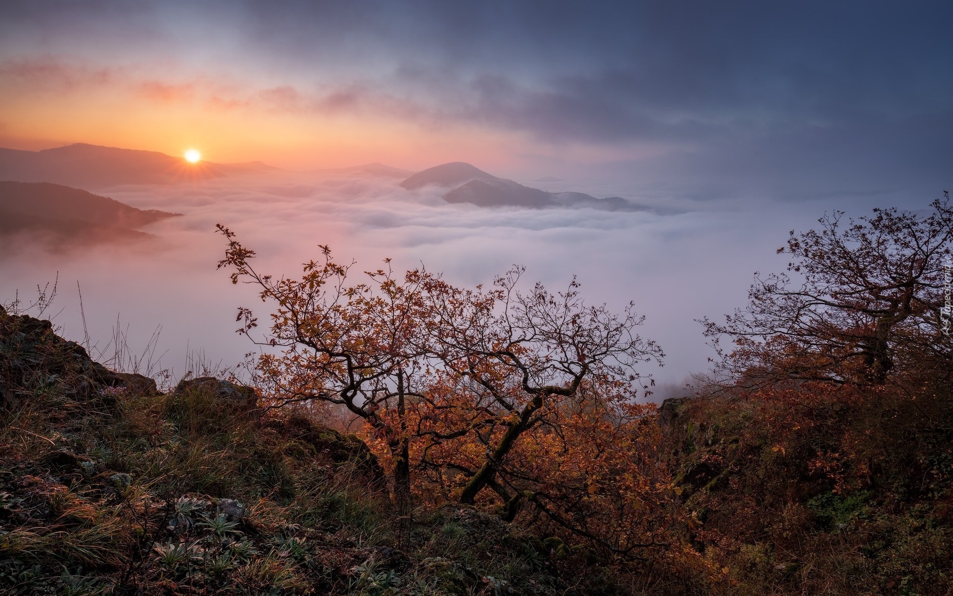 Edytor tapety: Gęsta mgła nad górami o wschodzie słońca