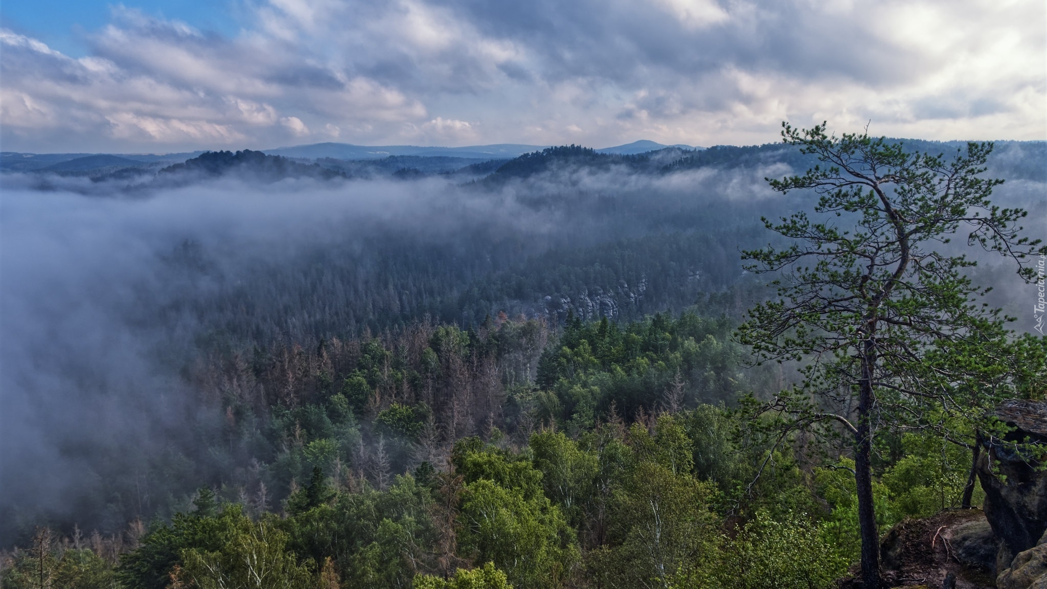 Edytor tapety: Mgła unosząca się nad zielonym lasem w górach