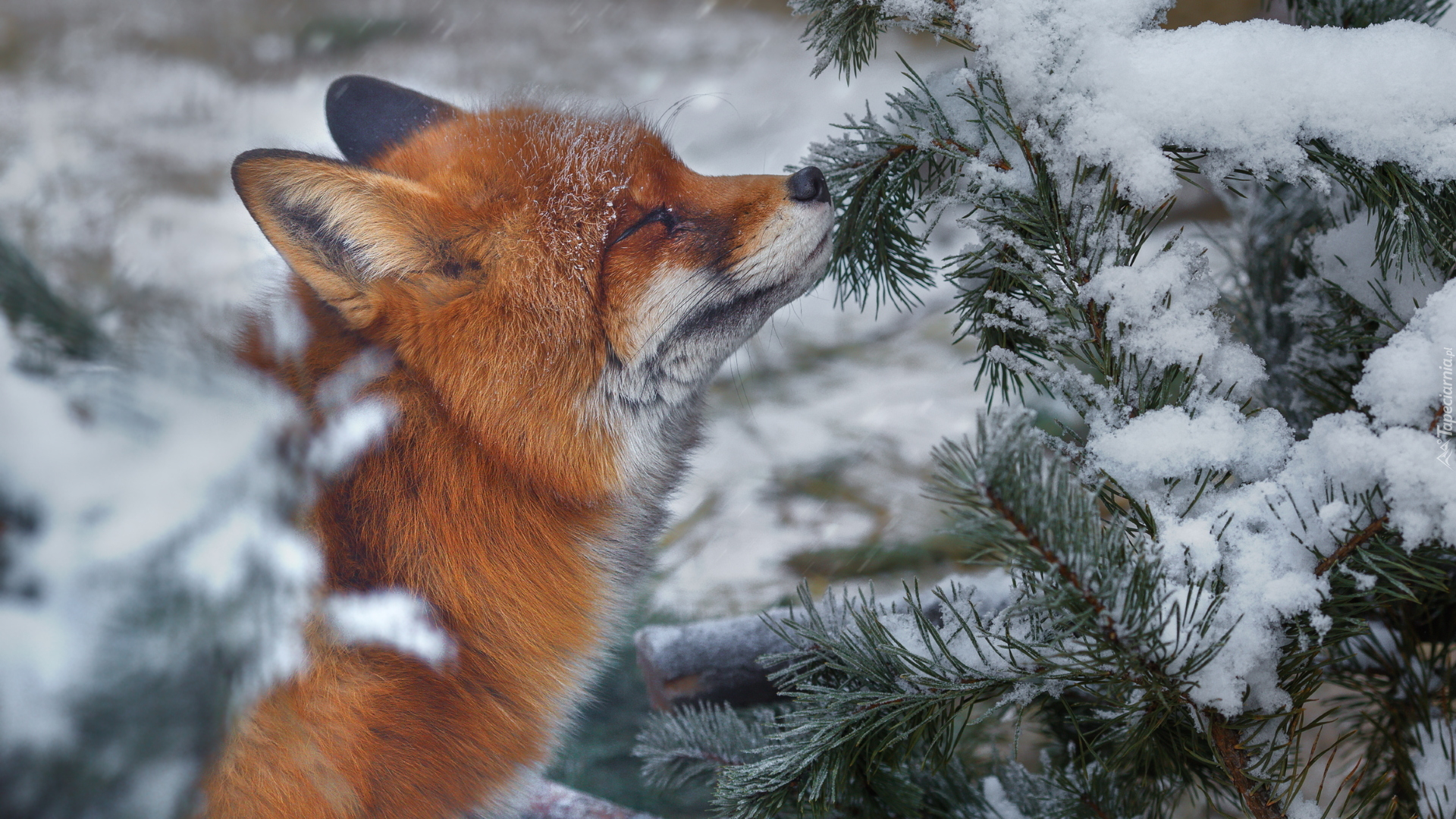 Edytor tapety: Rudy lis przy ośnieżonych gałązkach