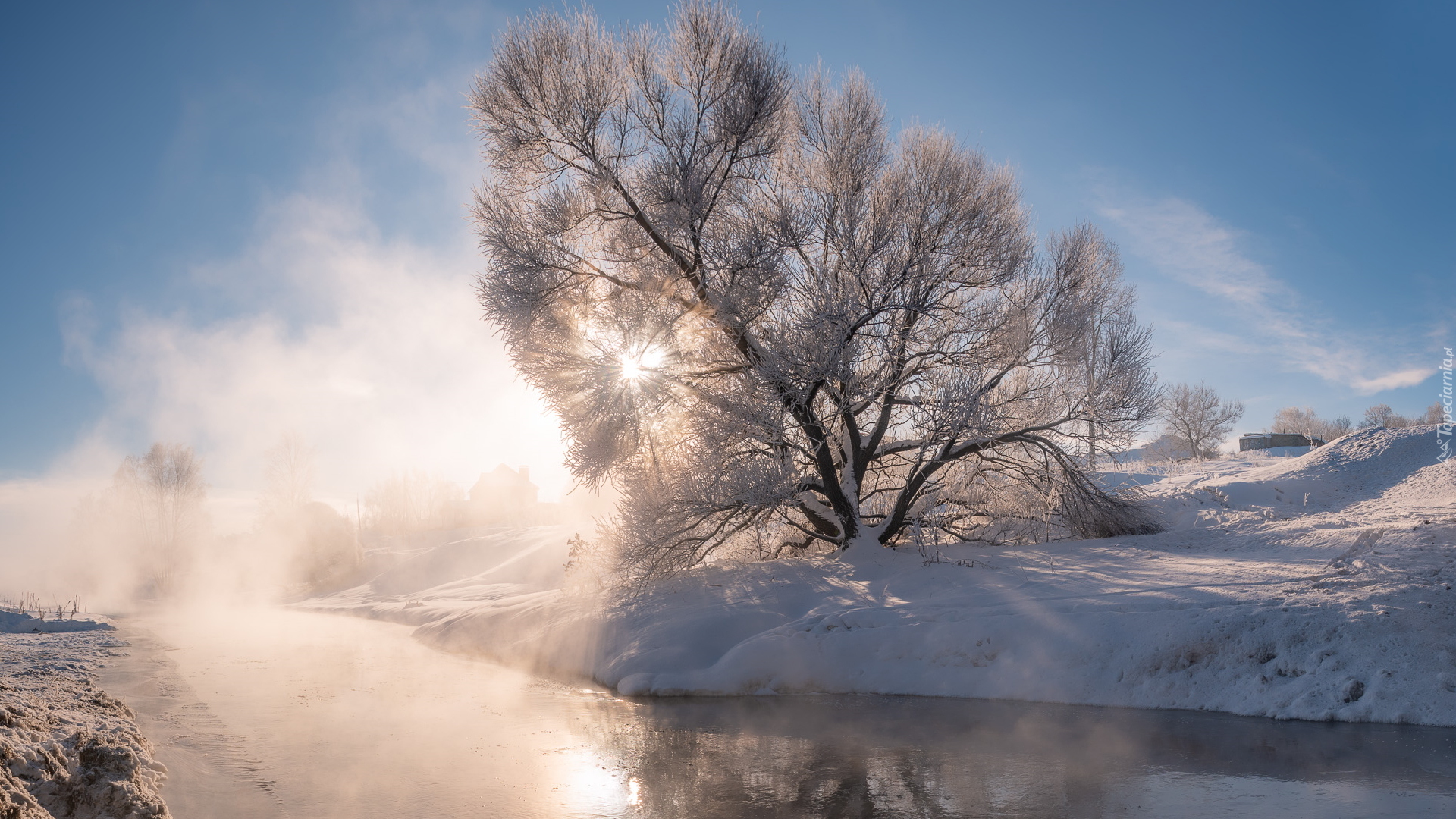 Edytor tapety: Ośnieżone drzewo we mgle nad rzeką
