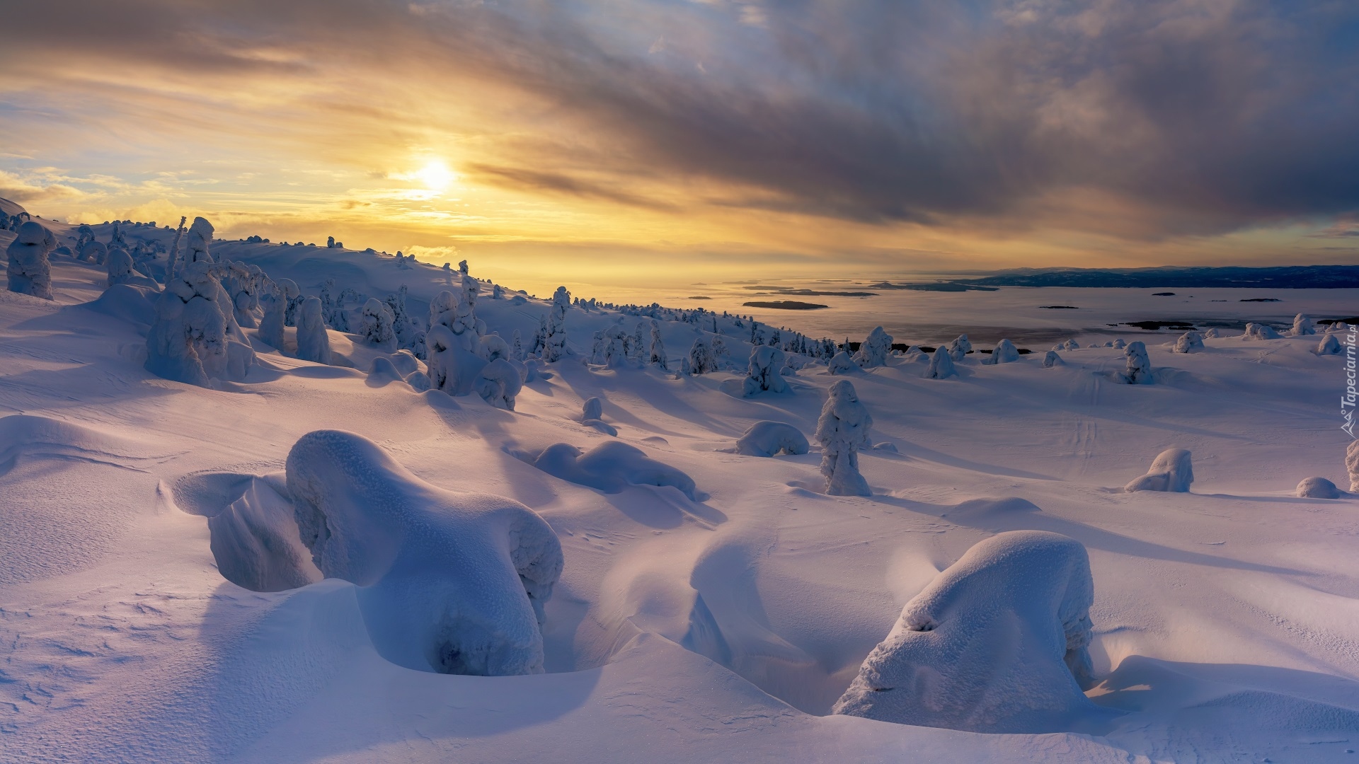 Edytor tapety: Zaśnieżone drzewa w zaspach w blasku słońca