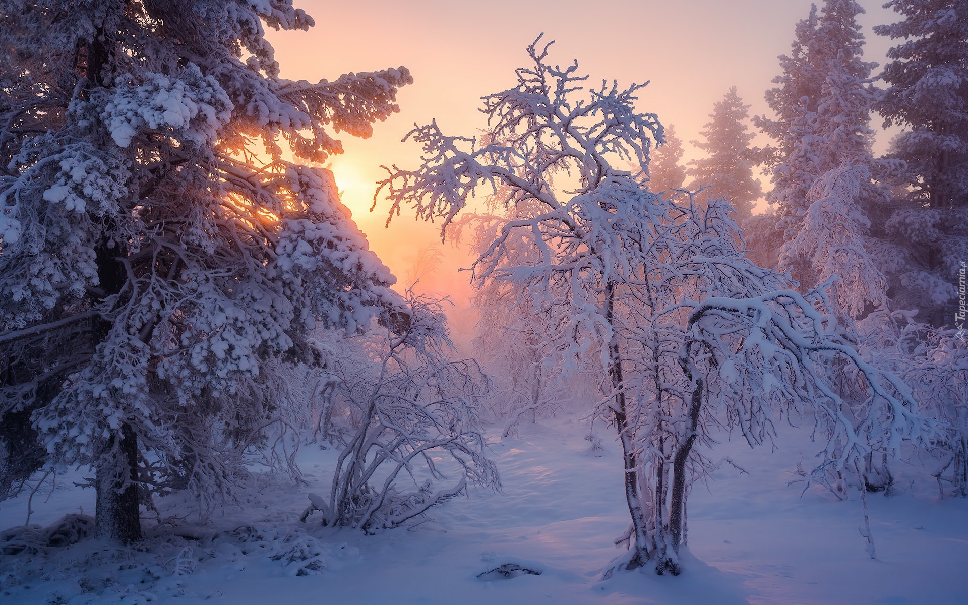 Edytor tapety: Ośnieżone drzewa w świetle słonecznym