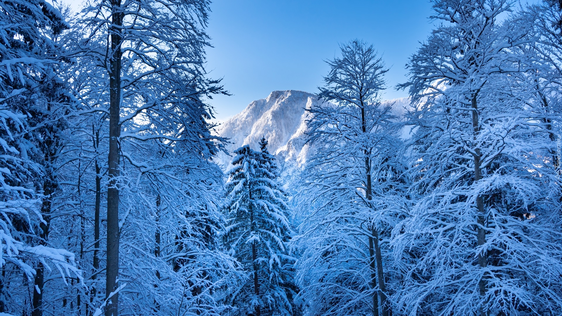 Edytor tapety: Ośnieżone drzewa i szczyty gór