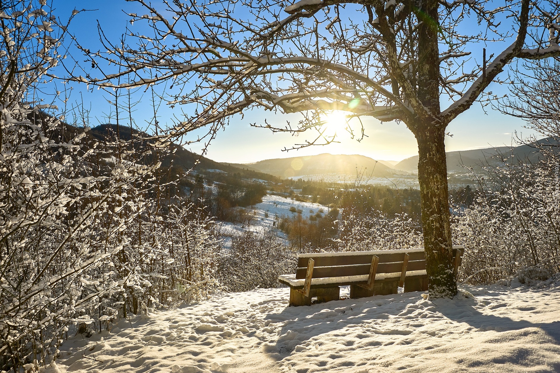 Edytor tapety: Widok z ośnieżonej ławki pod drzewem na góry