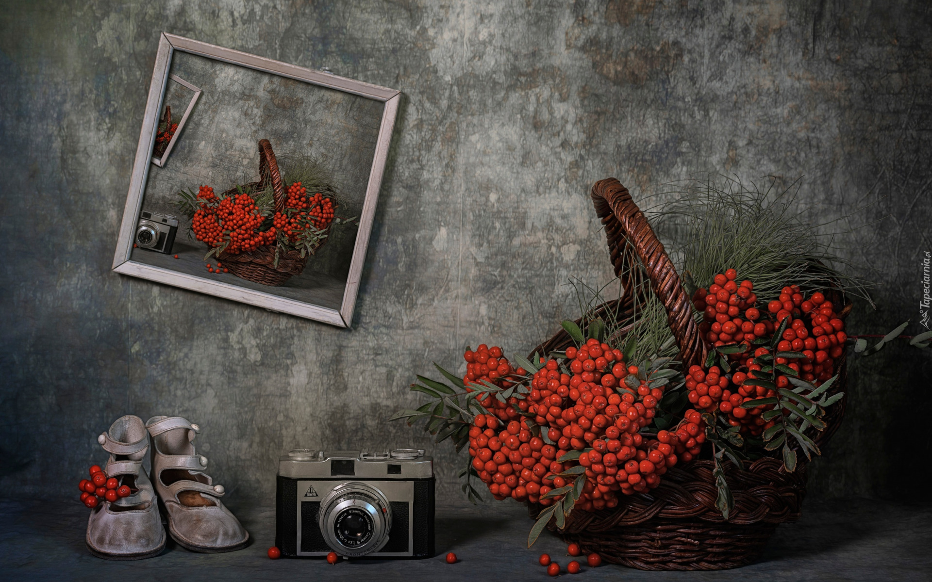 Edytor tapety: Jarzębina w koszyku obok aparatu fotograficznego i butów