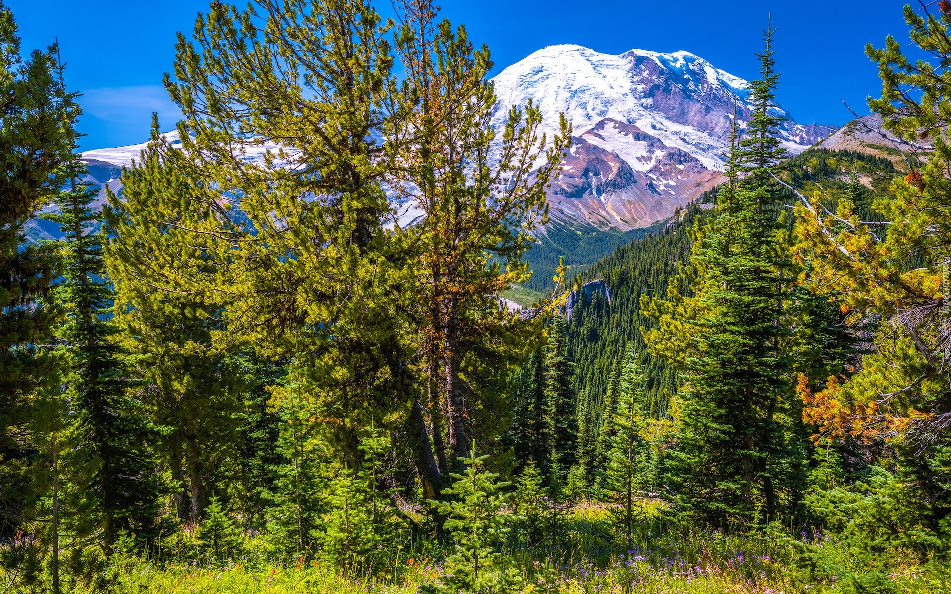 Edytor tapety: Zielone drzewa i ośnieżony stratowulkan Mount Rainier