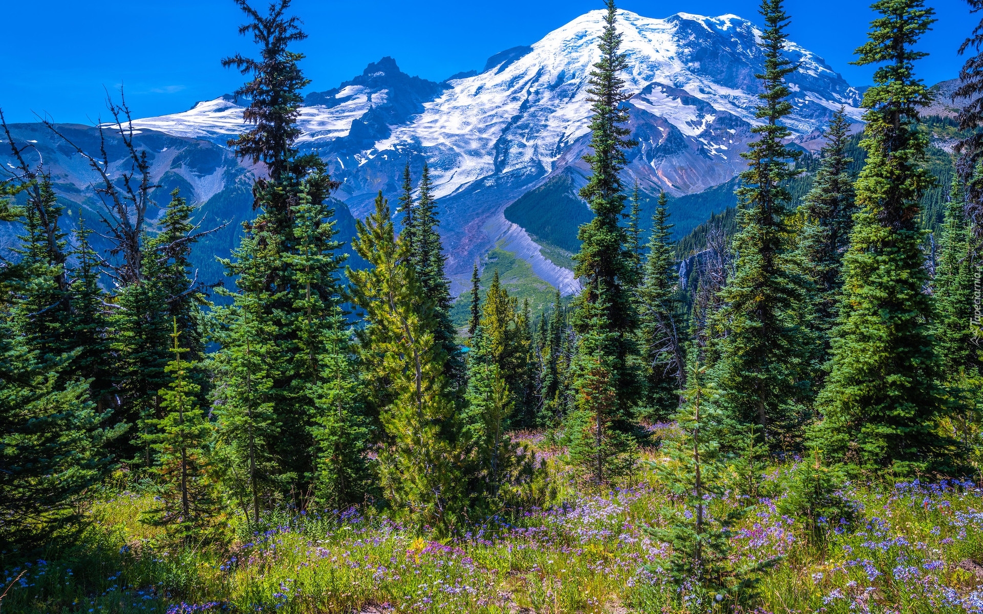 Edytor tapety: Zielone świerki na tle stratowulkanu Mount Rainier