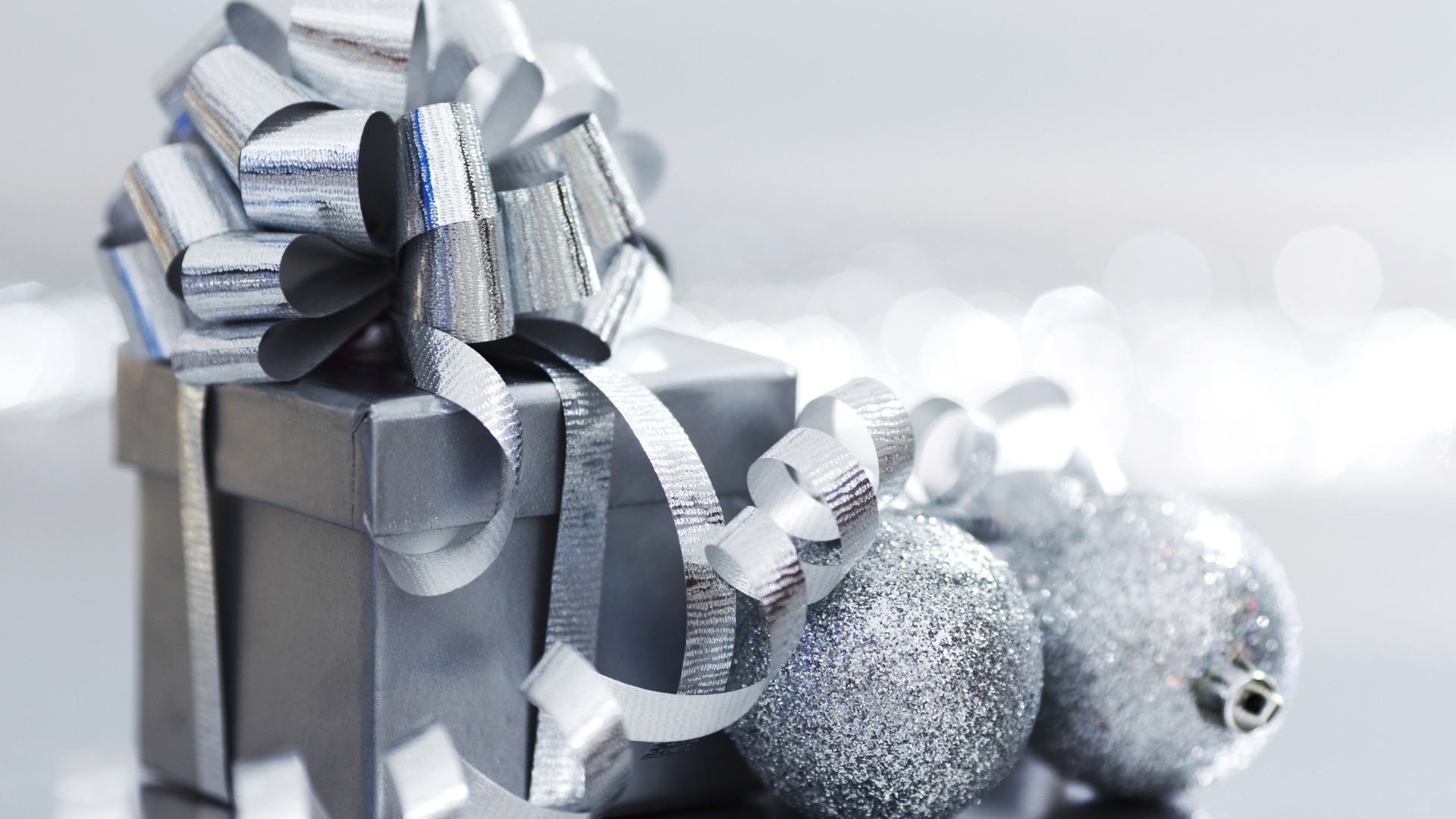 Edytor tapety: Srebrne bombki obok prezentu z kokardą