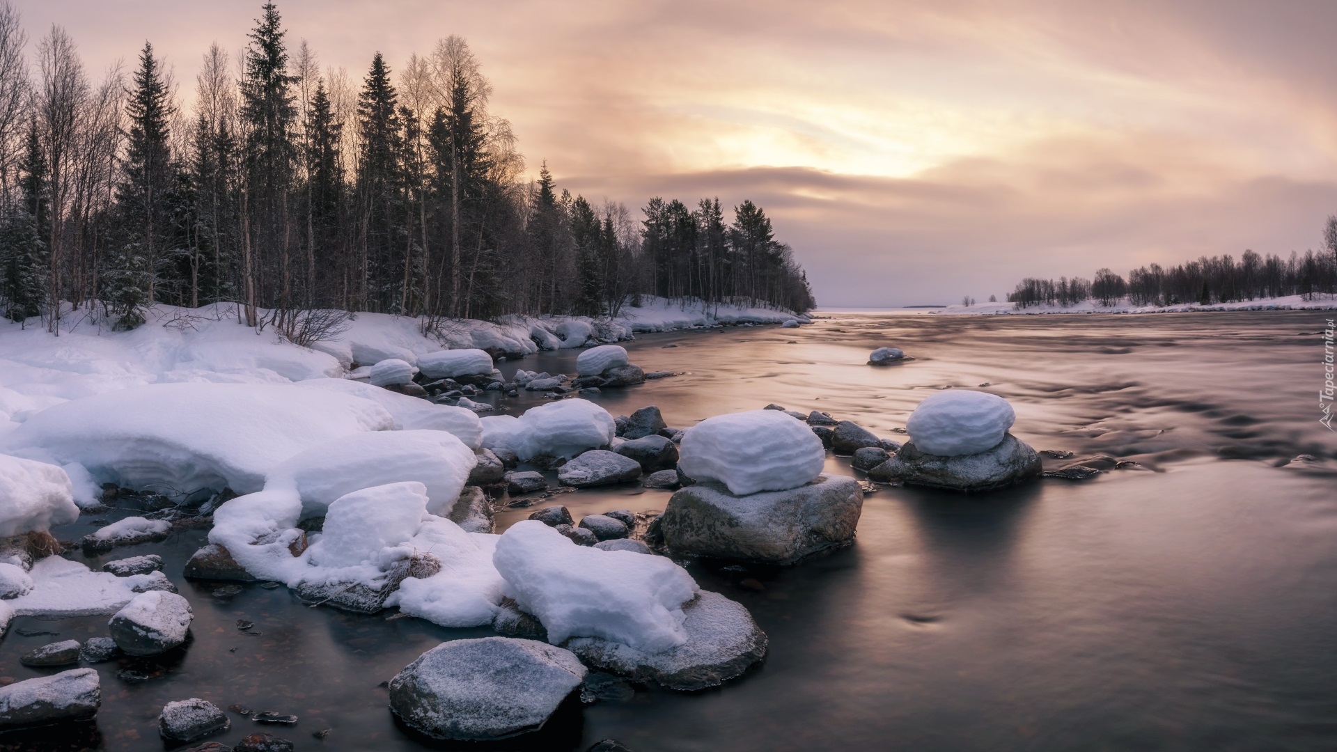 Edytor tapety: Ośnieżone kamienie i drzewa na brzegu rzeki