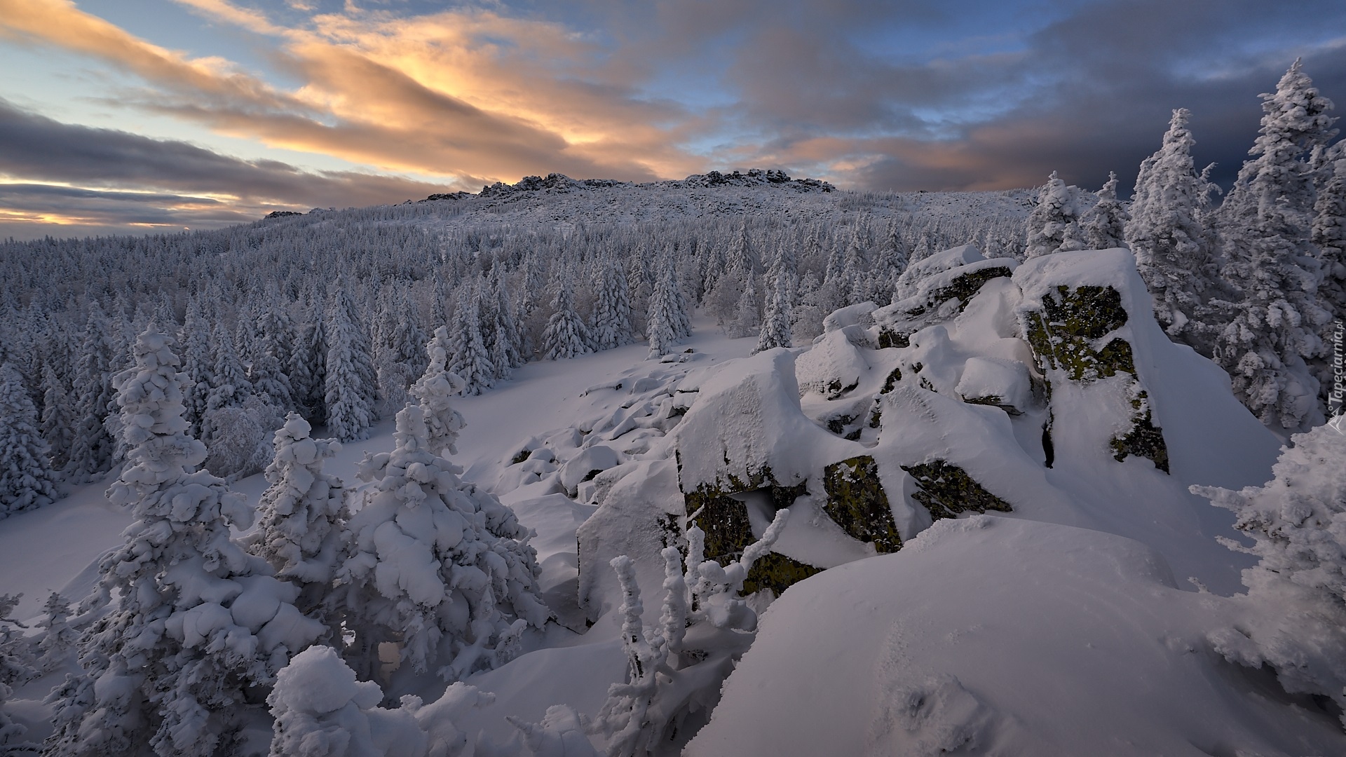 Edytor tapety: Ośnieżone skały i las w górach
