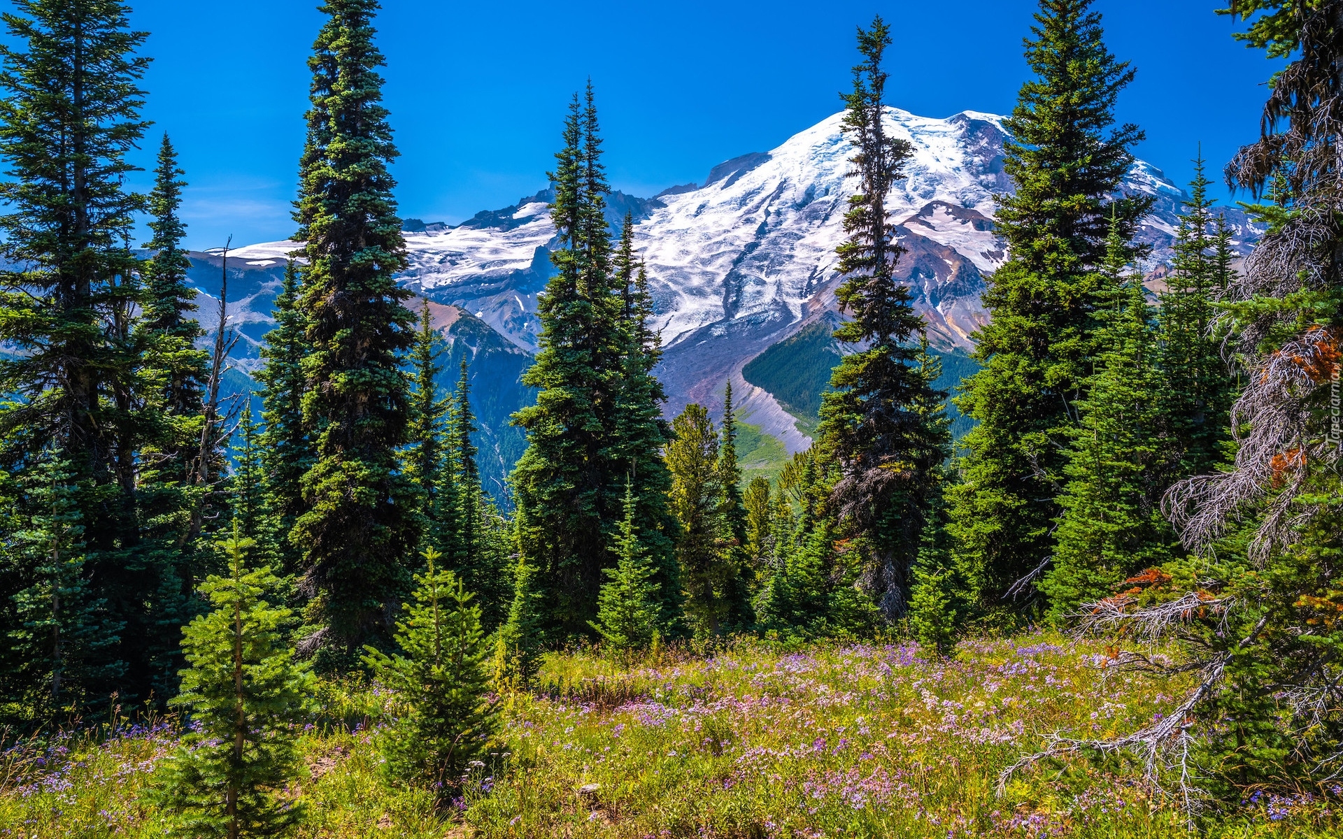 Edytor tapety: Świerki na tle ośnieżonego stratowulkanu Mount Rainier