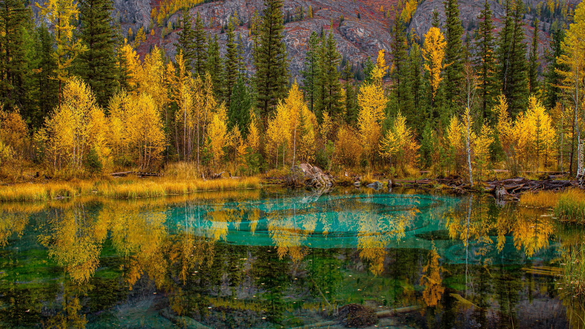 Edytor tapety: Pożółkłe drzewa i trawa nad górskim jeziorem