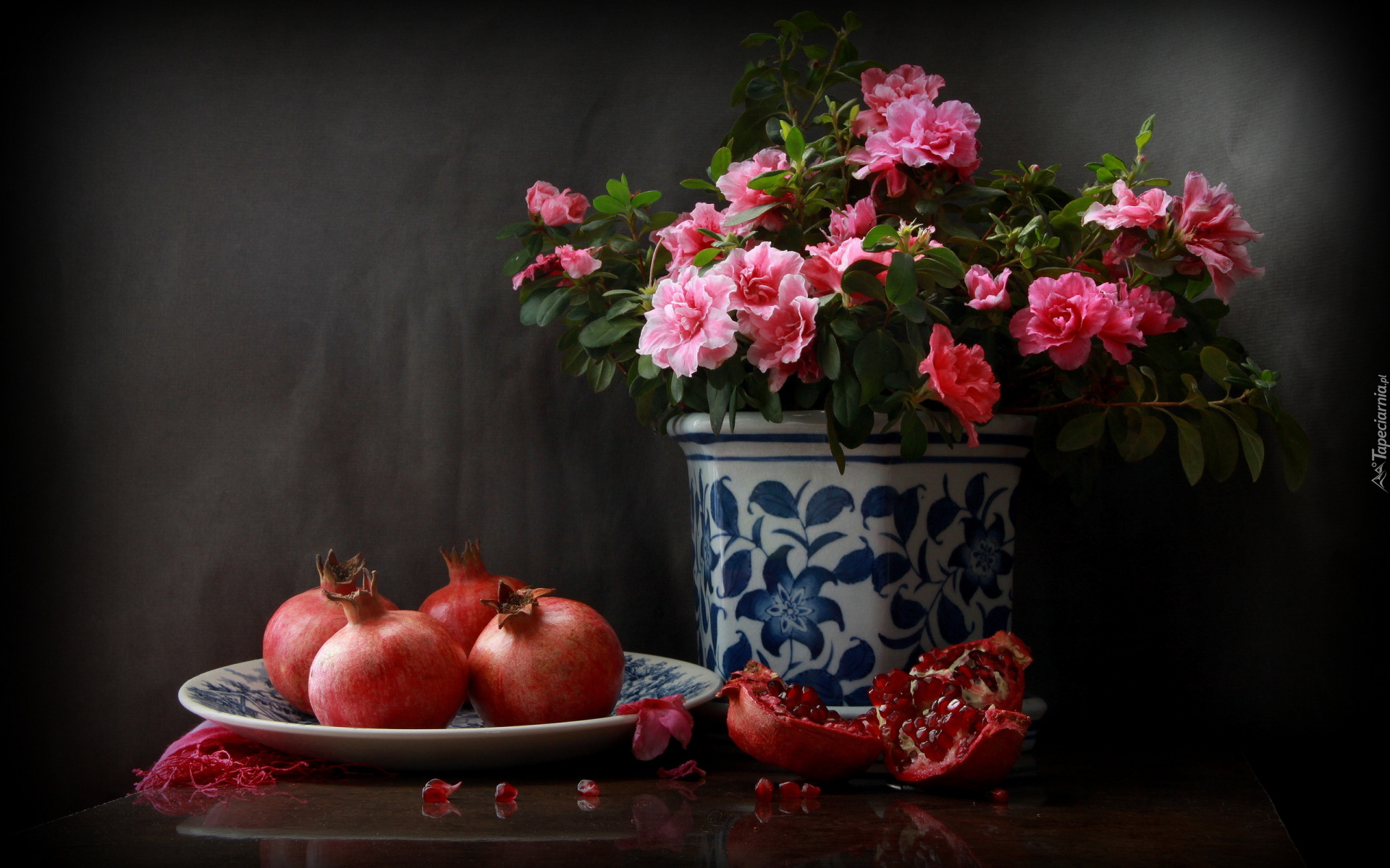 Edytor tapety: Azalia w malowanej doniczce obok granatów