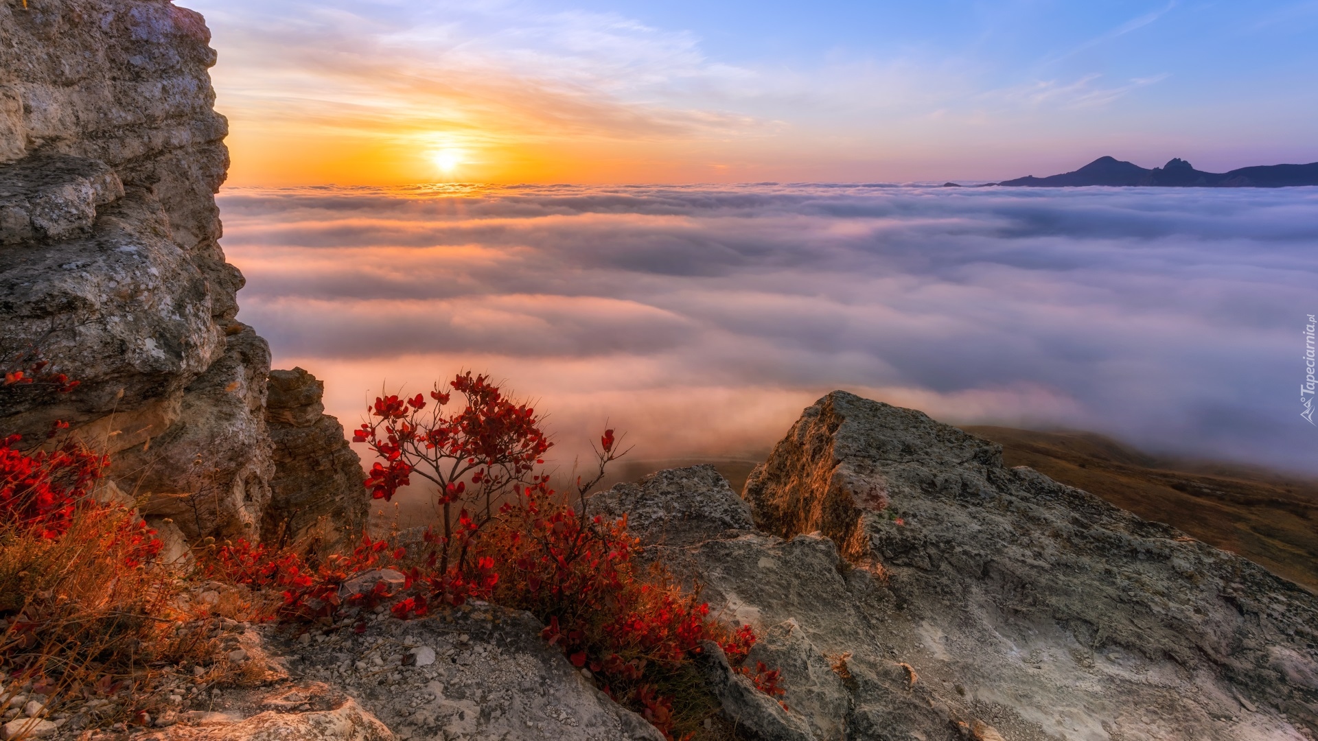 Edytor tapety: Widok ze skał na mgłę i wschodzące słońce