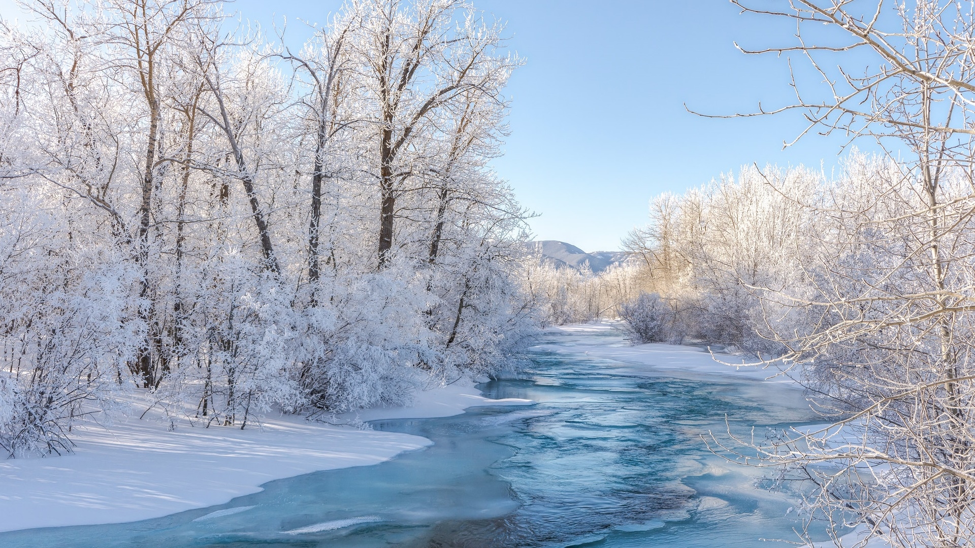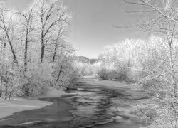 Edytor tapety: Ośnieżone drzewa na brzegu zamarzającej rzeki