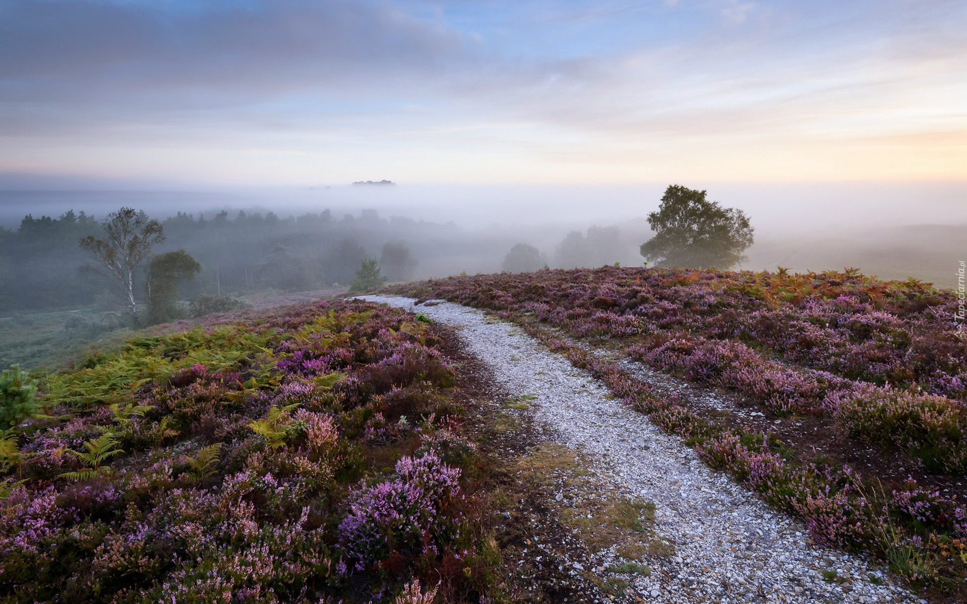 Edytor tapety: Drzewa i ścieżka na wrzosowisku w porannej mgle