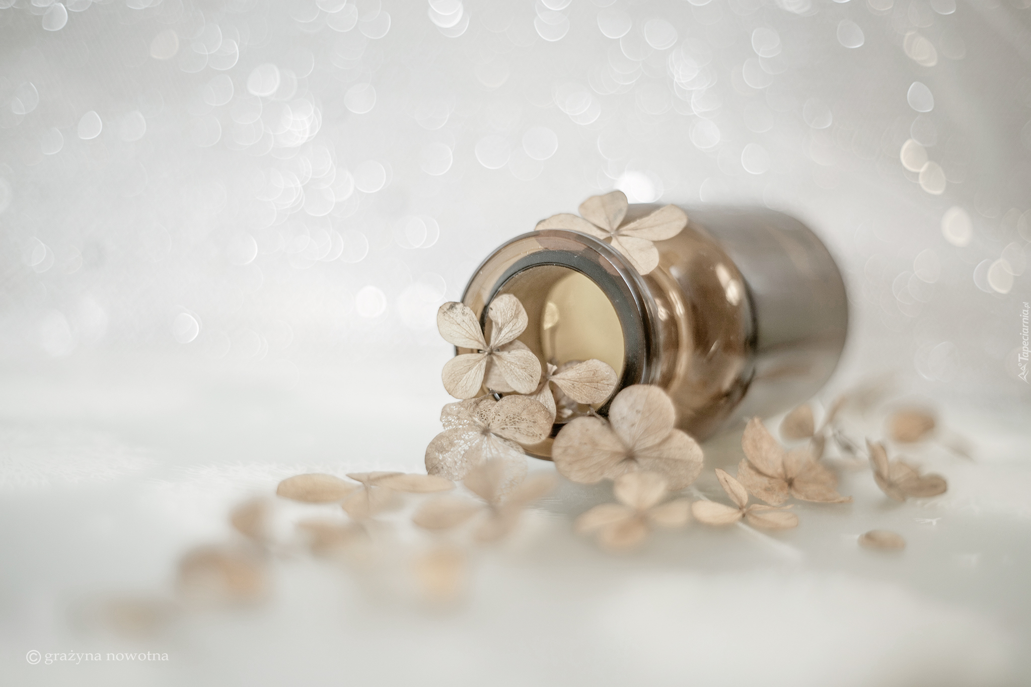 Edytor tapety: Suche kwiatuszki hortensji obok buteleczki