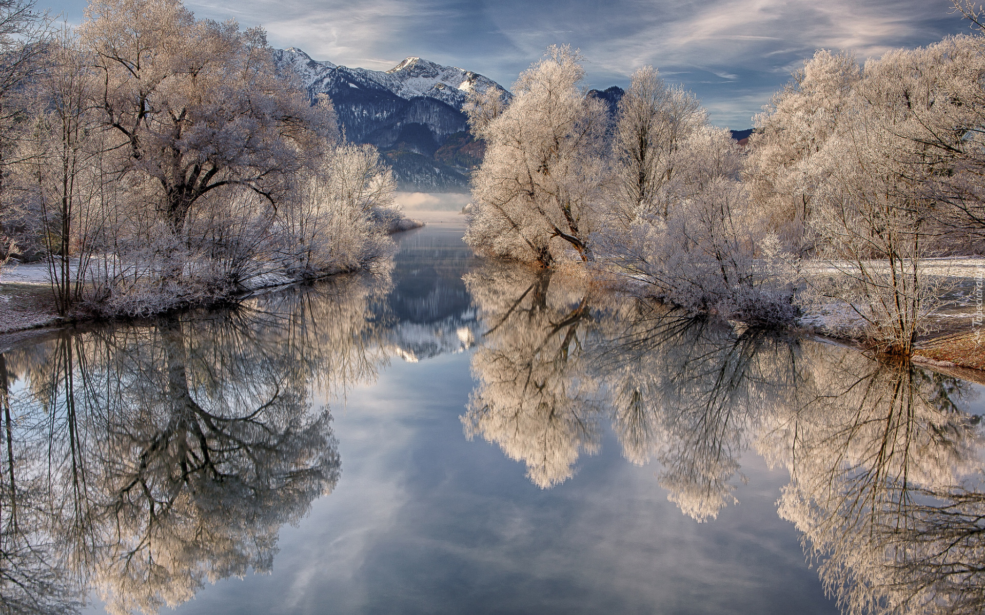 Edytor tapety: Odbicie oszronionych drzew w jeziorze