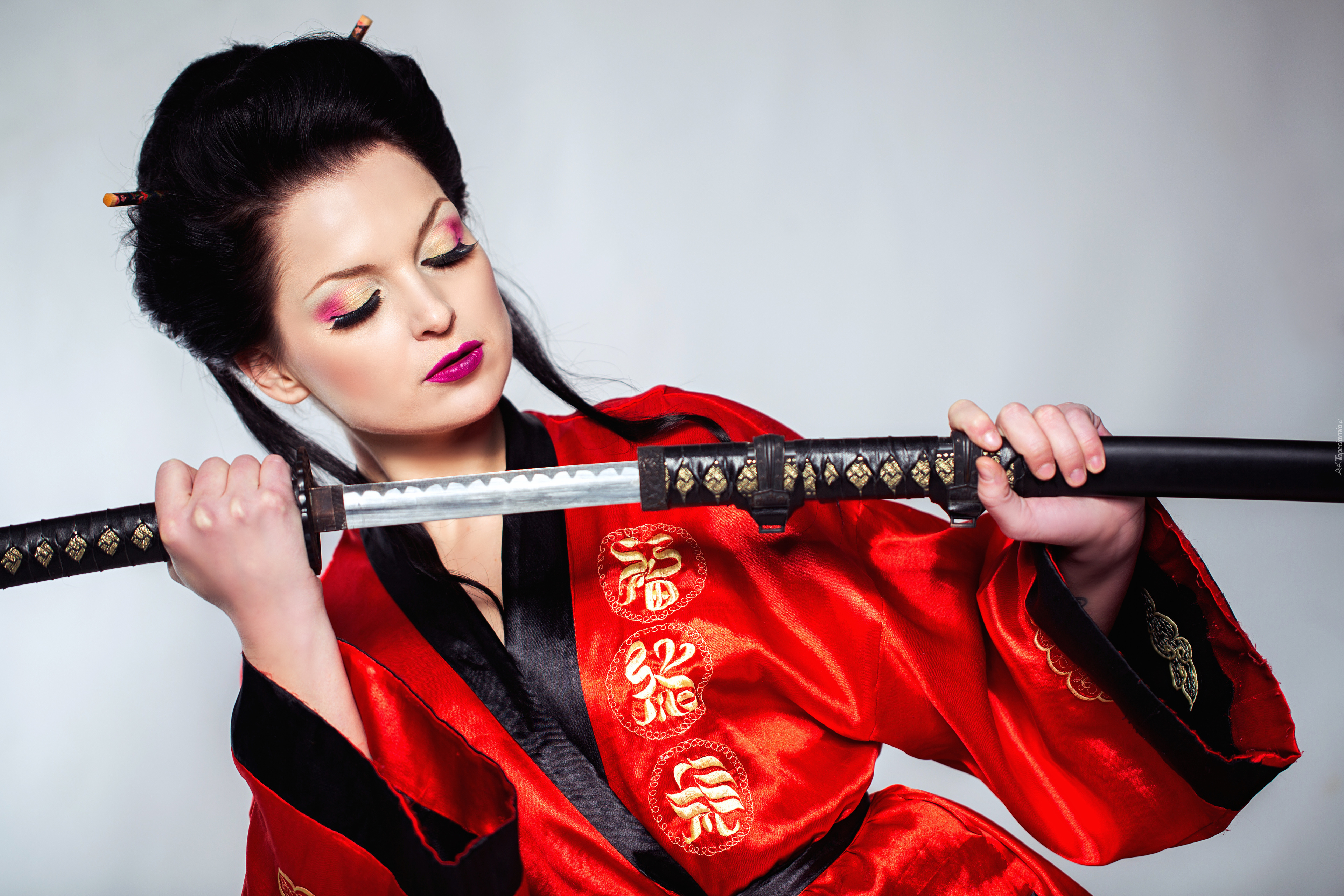 Edytor tapety: Kobieta w czerwonym kimono z mieczem samurajskim