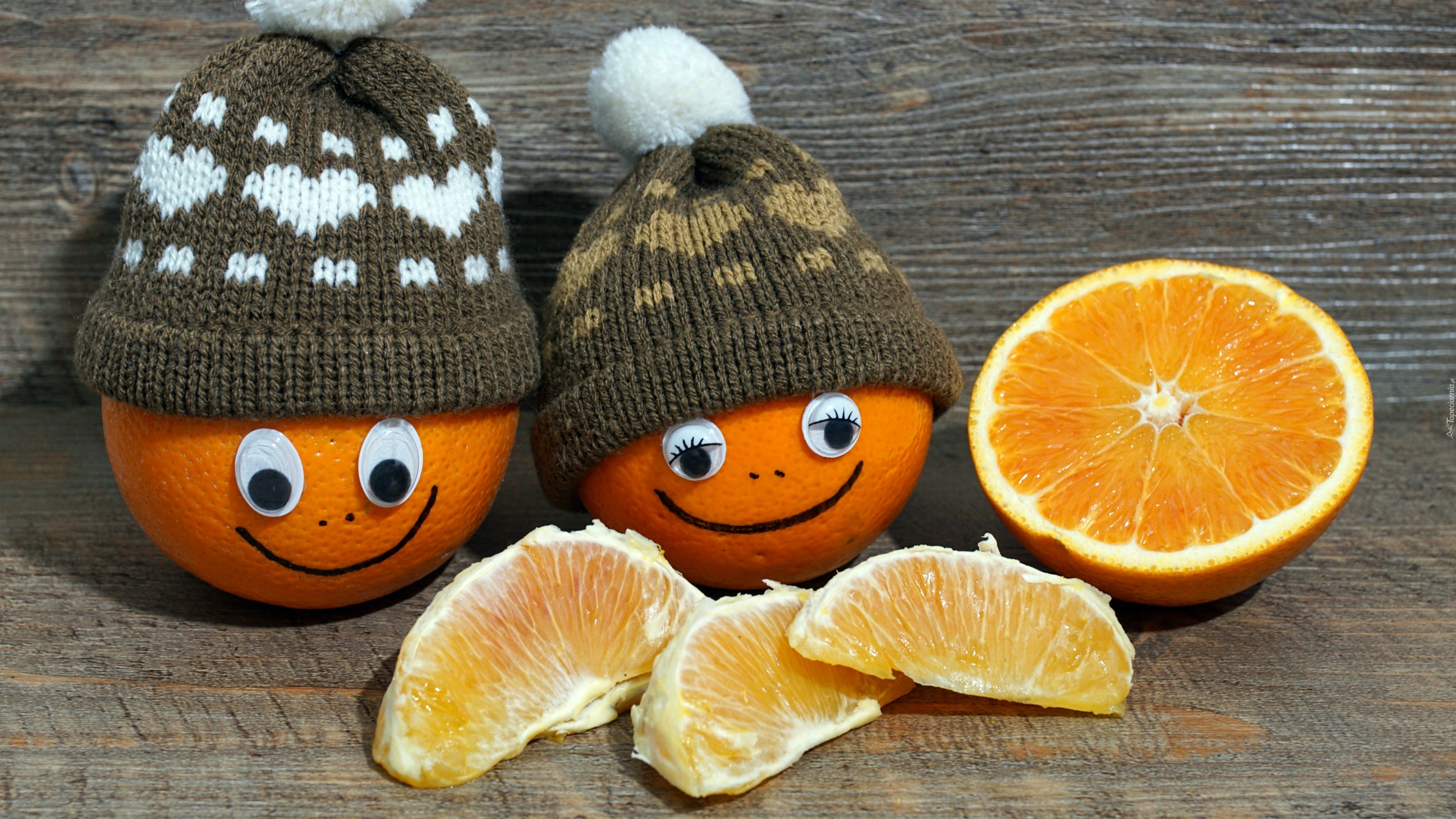 Edytor tapety: Uśmiechnięte pomarańcze w zimowych czapeczkach