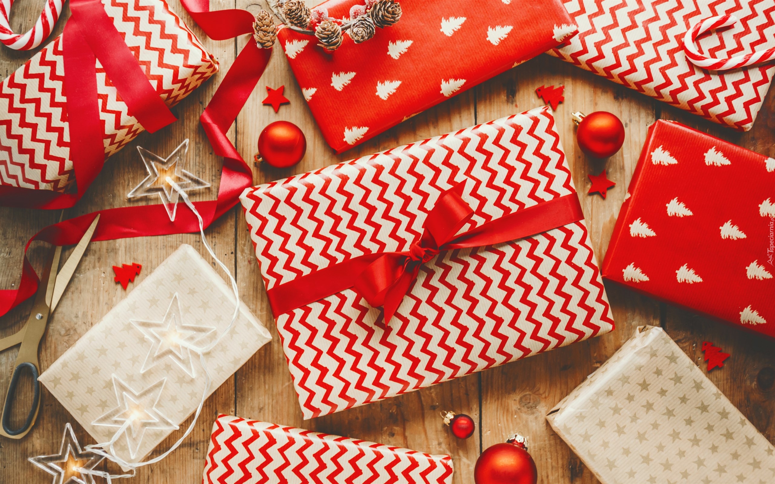 Edytor tapety: Świąteczne prezenty i bombki na deskach