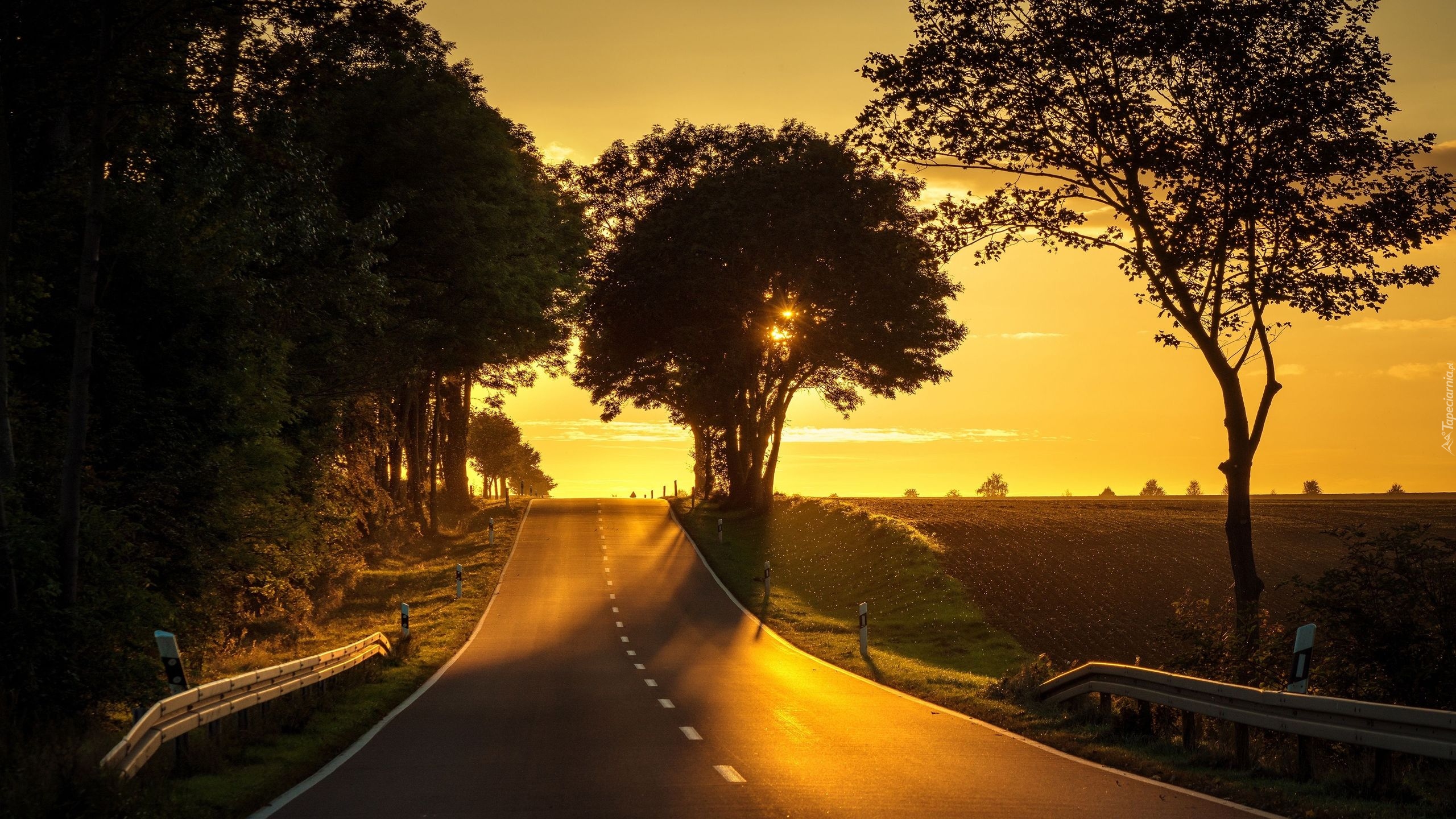 Edytor tapety: Drzewa przy drodze w blasku zachodzącego słońca