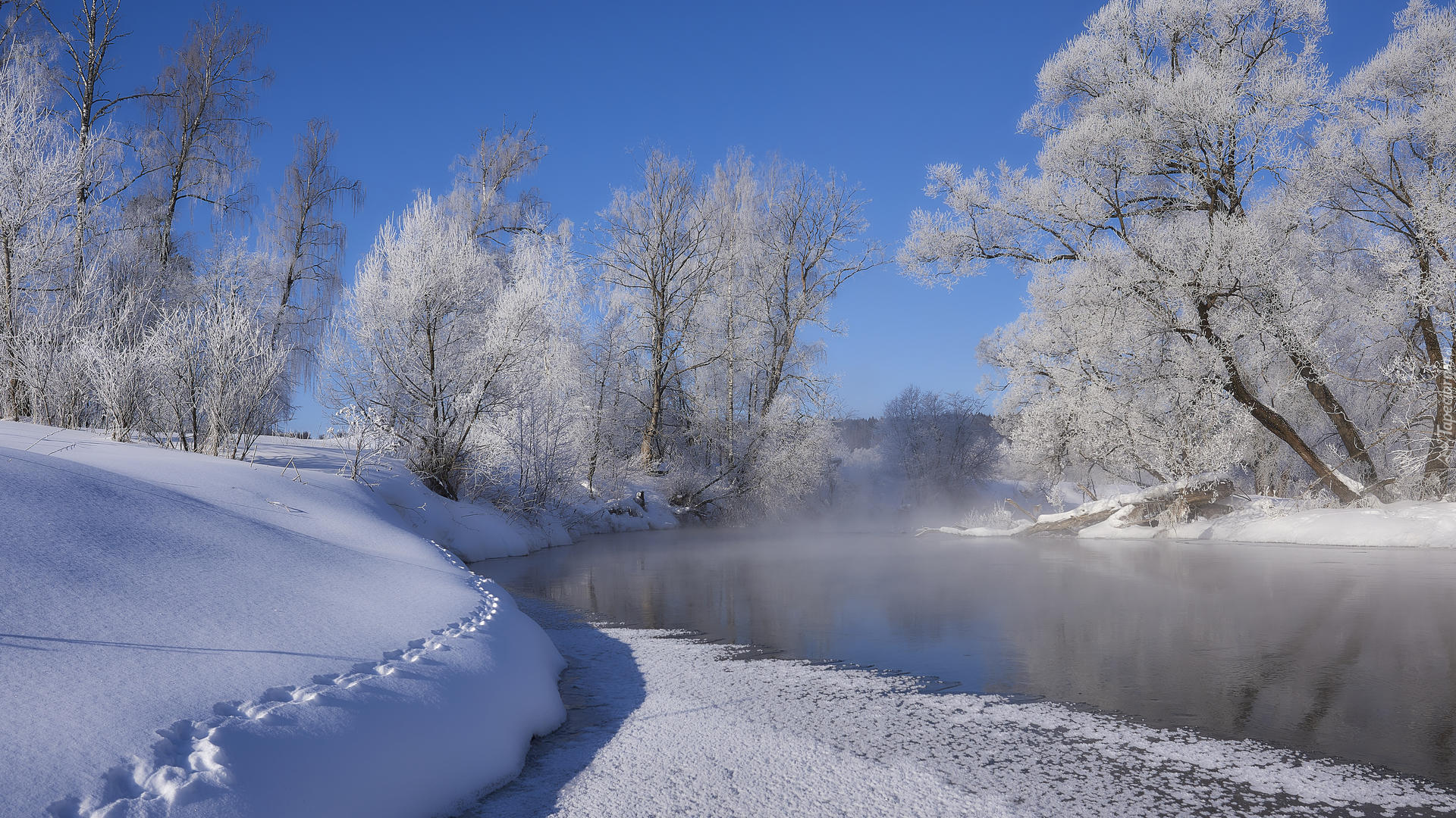 Edytor tapety: Drzewa i zaspy śniegu na brzegu zamarzniętej rzeki