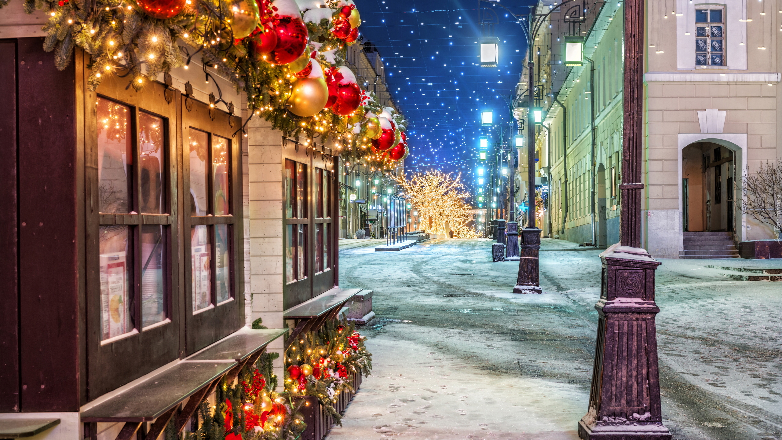 Edytor tapety: Domy i latarnie przy uliczce w świątecznej scenerii