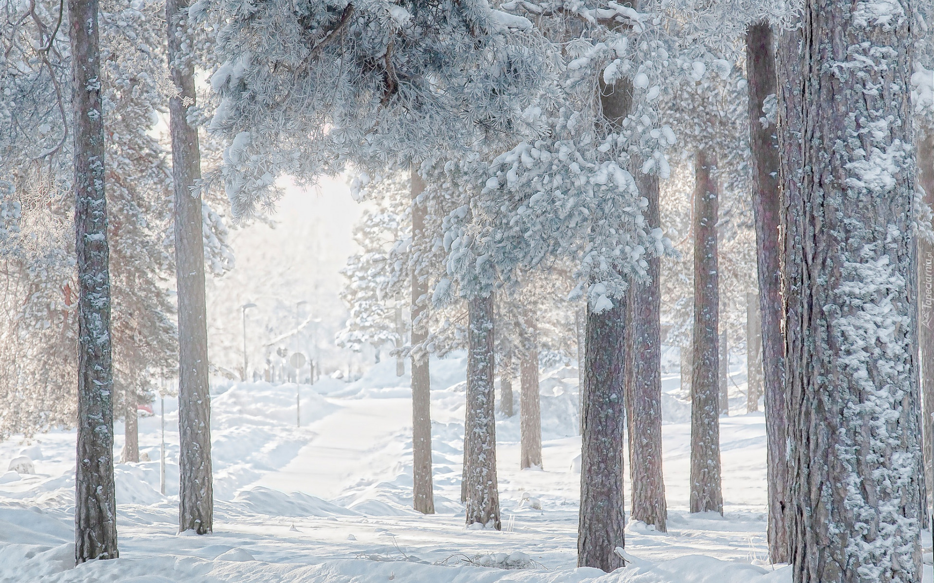 Edytor tapety: Zamglony zimowy las w słonecznym blasku