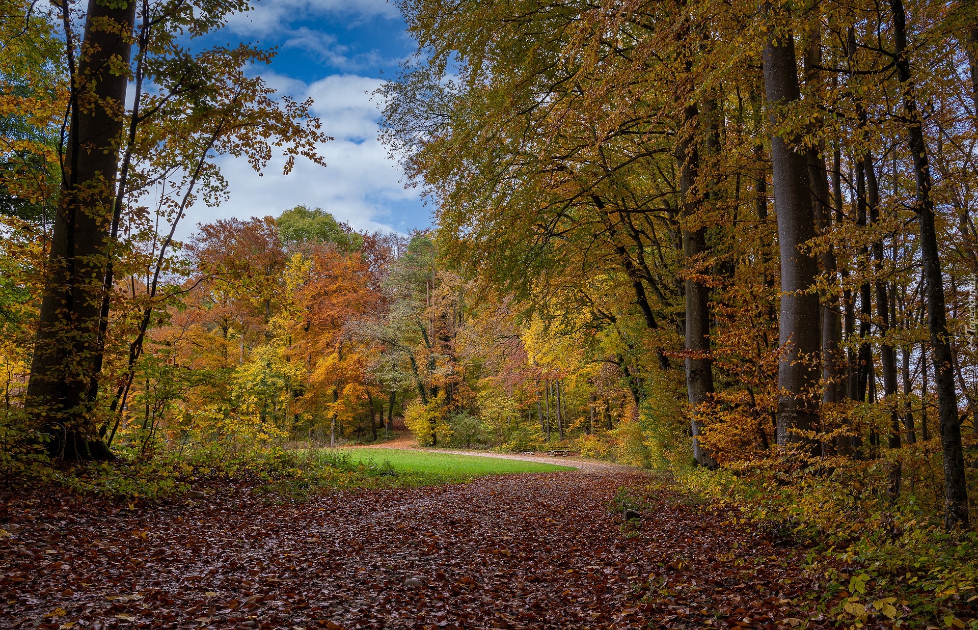 Edytor tapety: Jesienne drzewa przy drodze zasypanej liśćmi