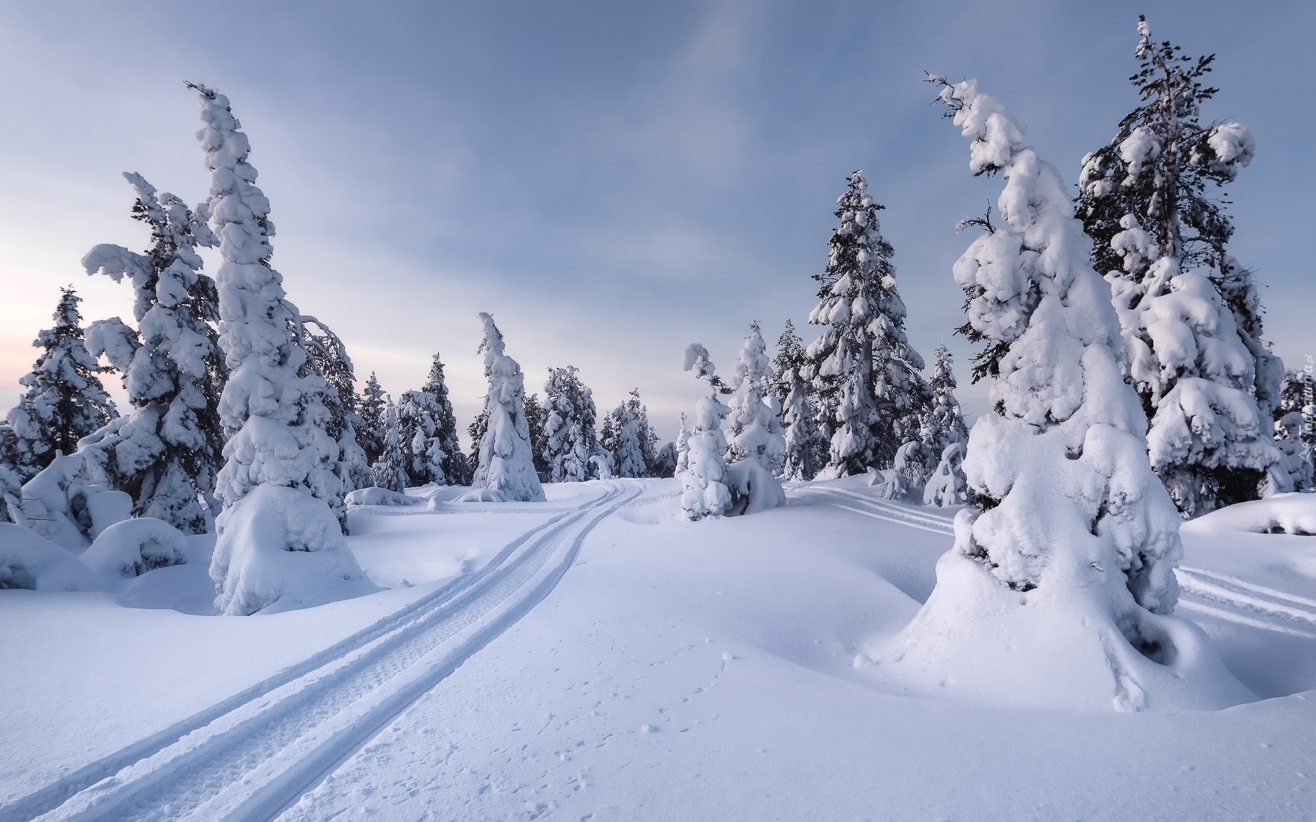 Edytor tapety: Ślady opon na śniegu pośród ośnieżonych świerków